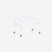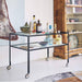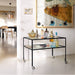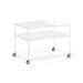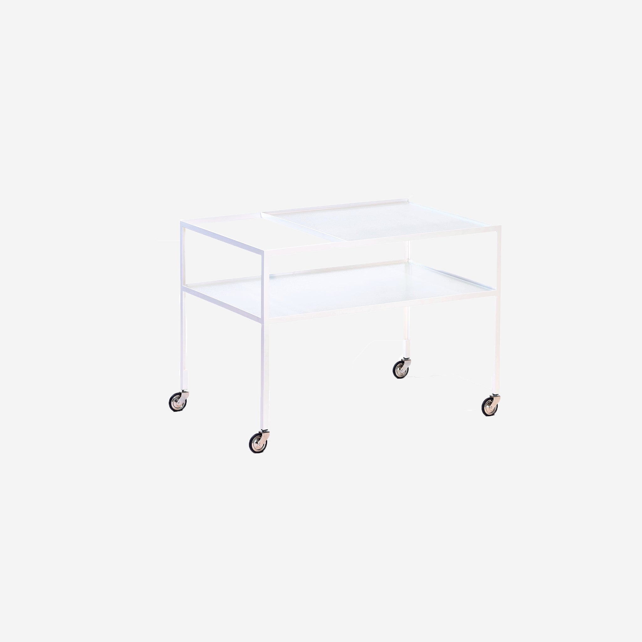 Der Barwagen, das Kultmöbel von Herbert Hirche aus dem Jahr 1956, neu produziert im alten Glanz: schwarz, weiß oder grau beschichtete Stahlwinkel, klassische 50er Jahre Rollen und das originale Riffelglas.