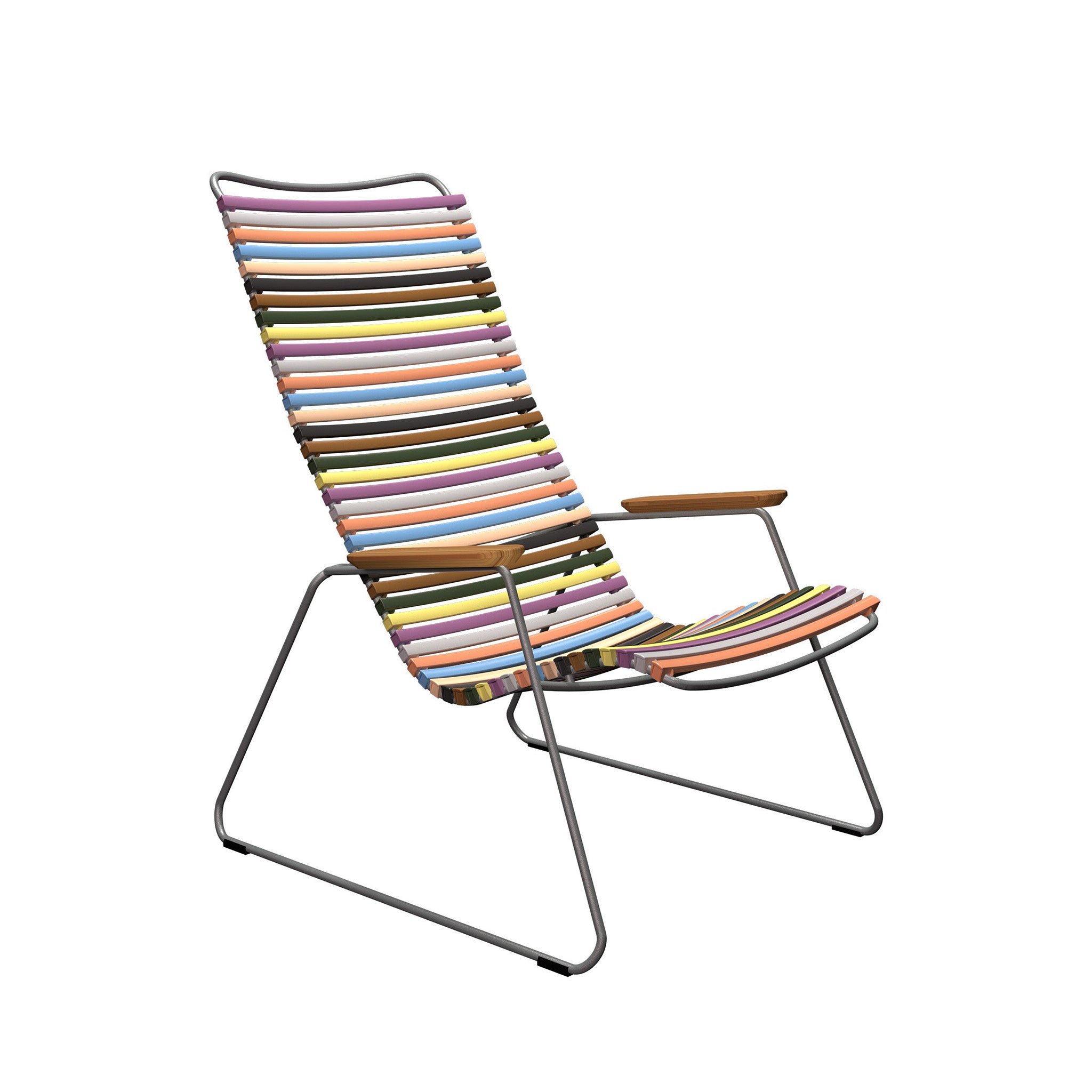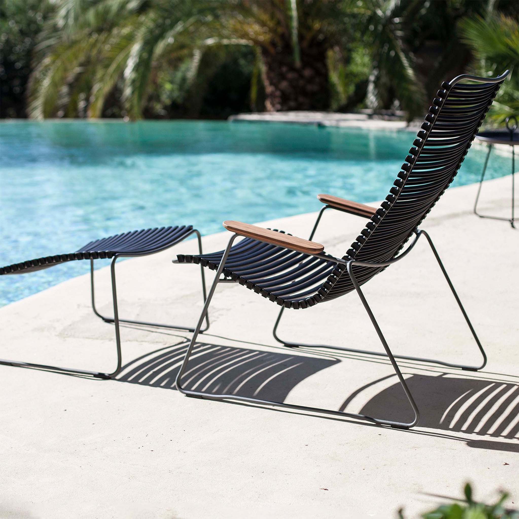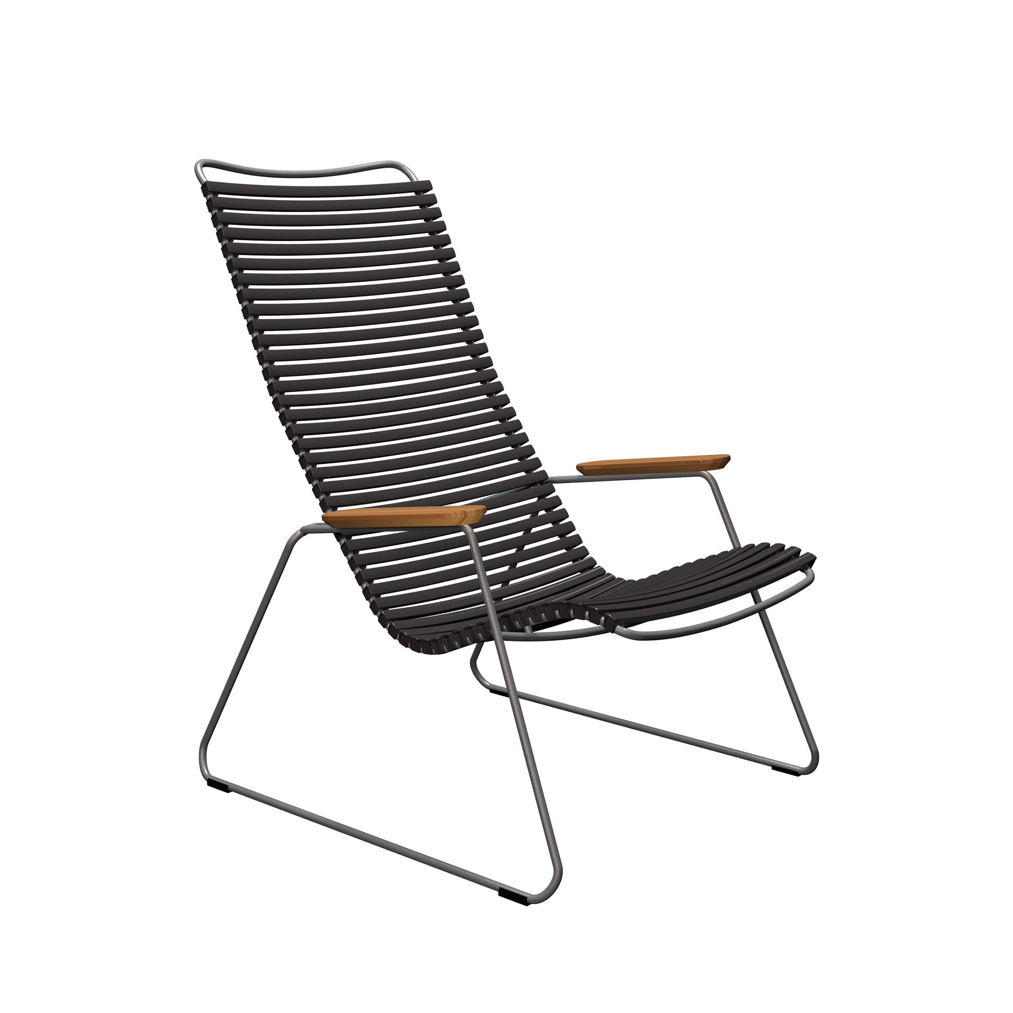 Der Click Lounge Sessel aus der beliebten Click Outdoor-Kollektion von Houe lädt mit seiner dezent eleganten Gestaltung zum entspannten Zurücklehnen ein. Das stimmige Zusammenspiel aus Metallgestell, sanft geschwungenen Lamellen und Armlehnen aus Bambus geht auf den skandinavischen Designer Henrik Pedersen zurück. Dank der flexiblen Kunststofflamellen benötigt der Click Lounge Chair kein zusätzliches Polster – und sie lassen sich bei Bedarf mühelos austauschen.
