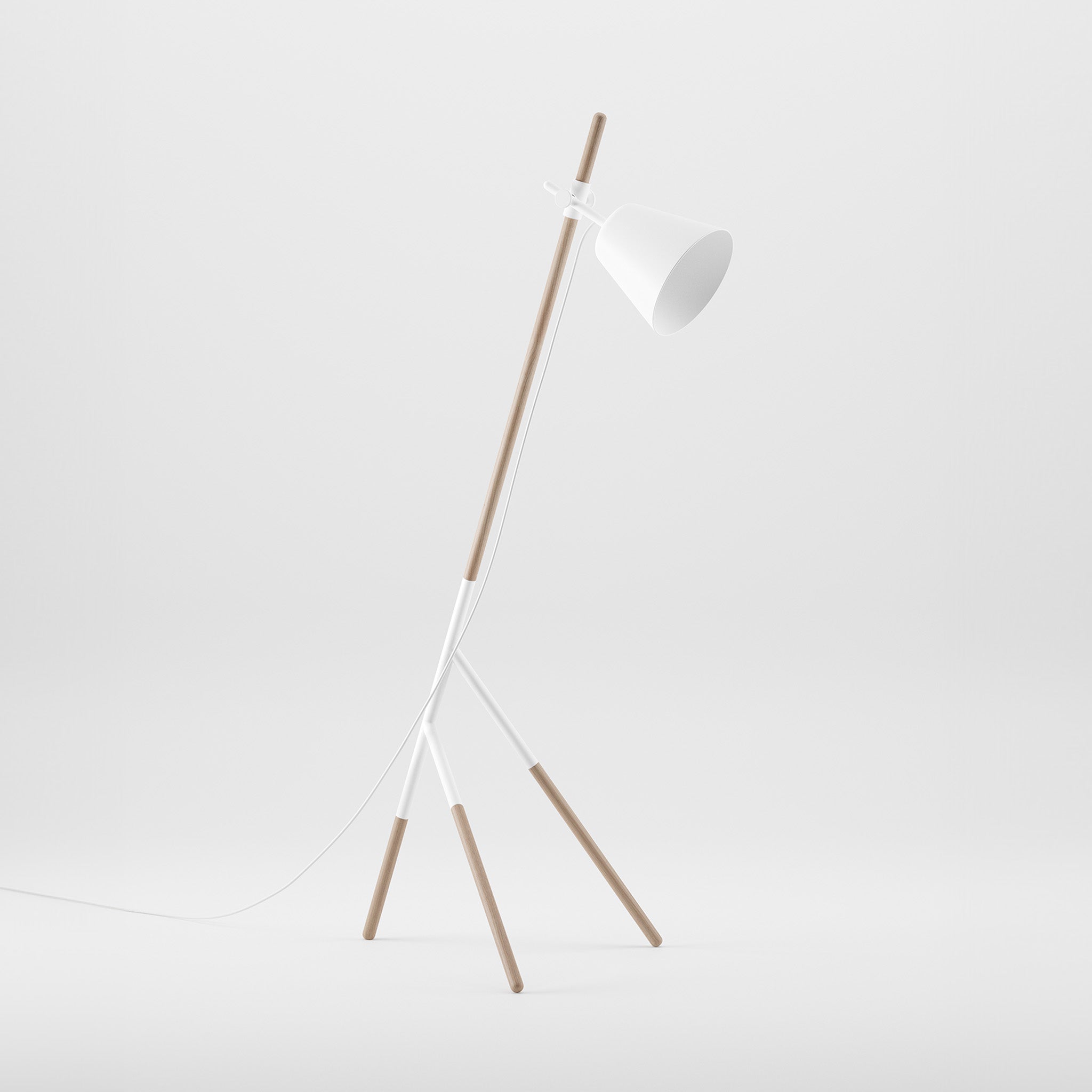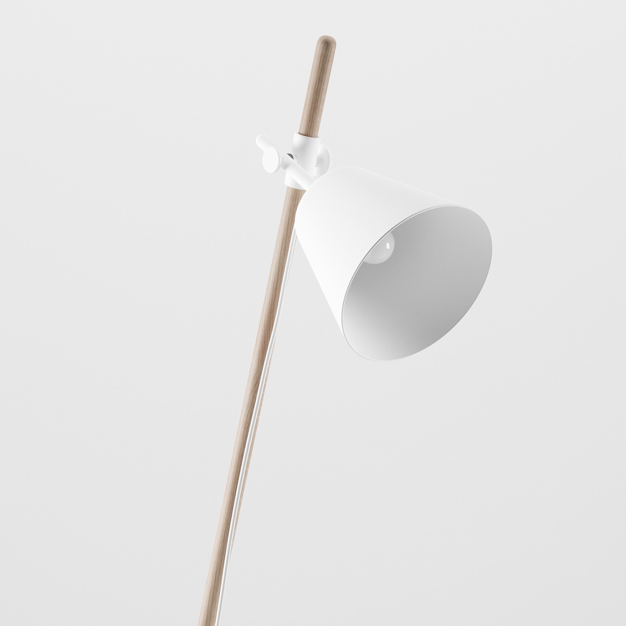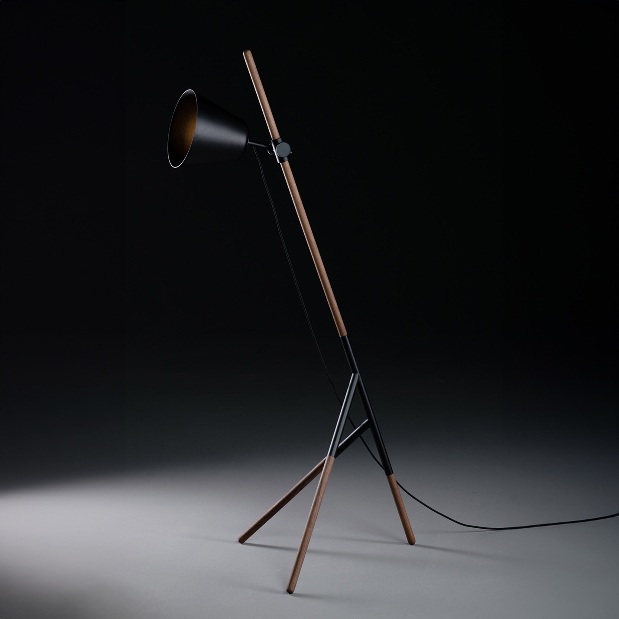 Das Licht wird durch einen stählernen Mantel in Form eines gestutzten Kegels umhüllt und gebündelt, der auf einem Holzständer befestigt ist – entlang einer Linie, auf der es gleitet und so Höhe und Winkel des Lichtstrahls verändert.
