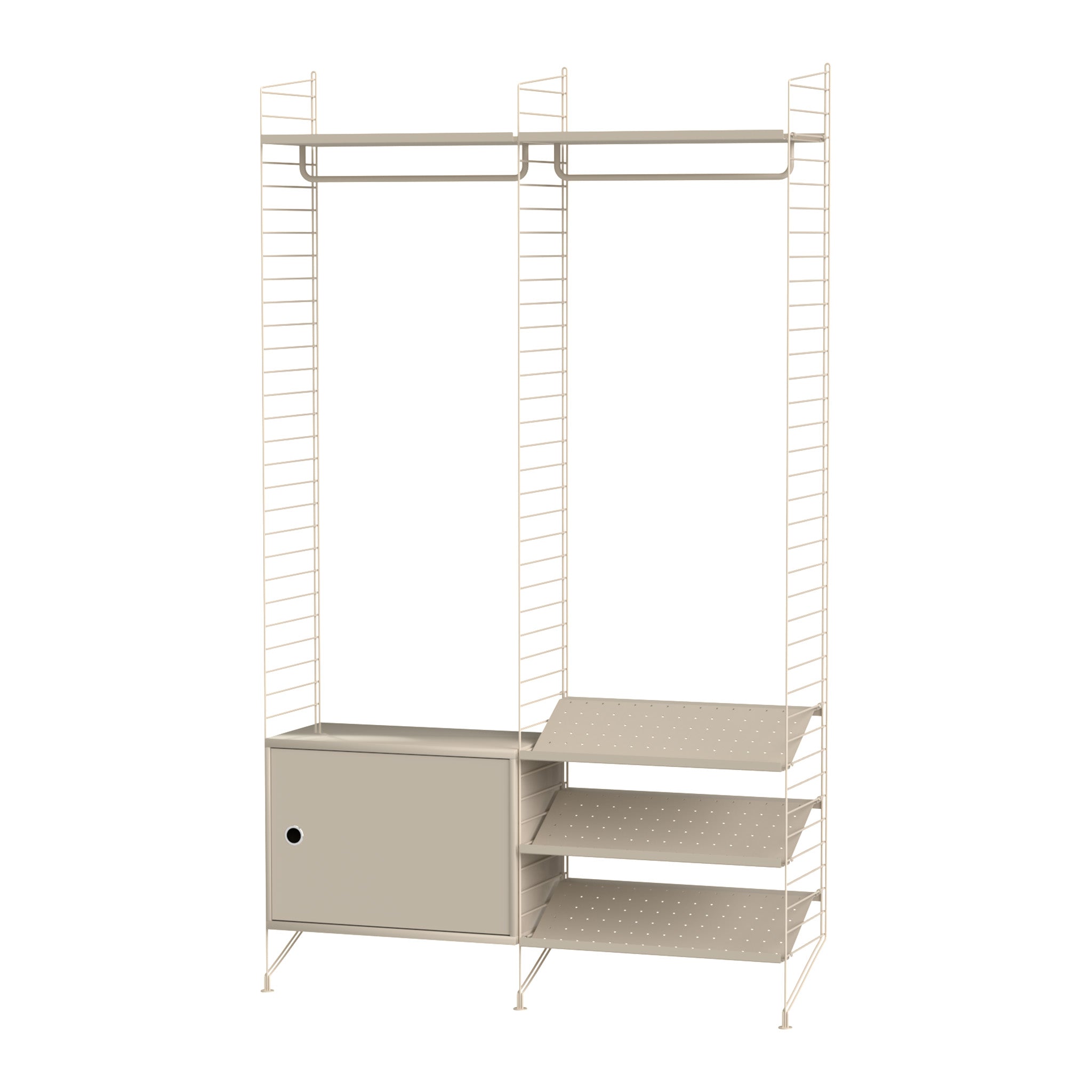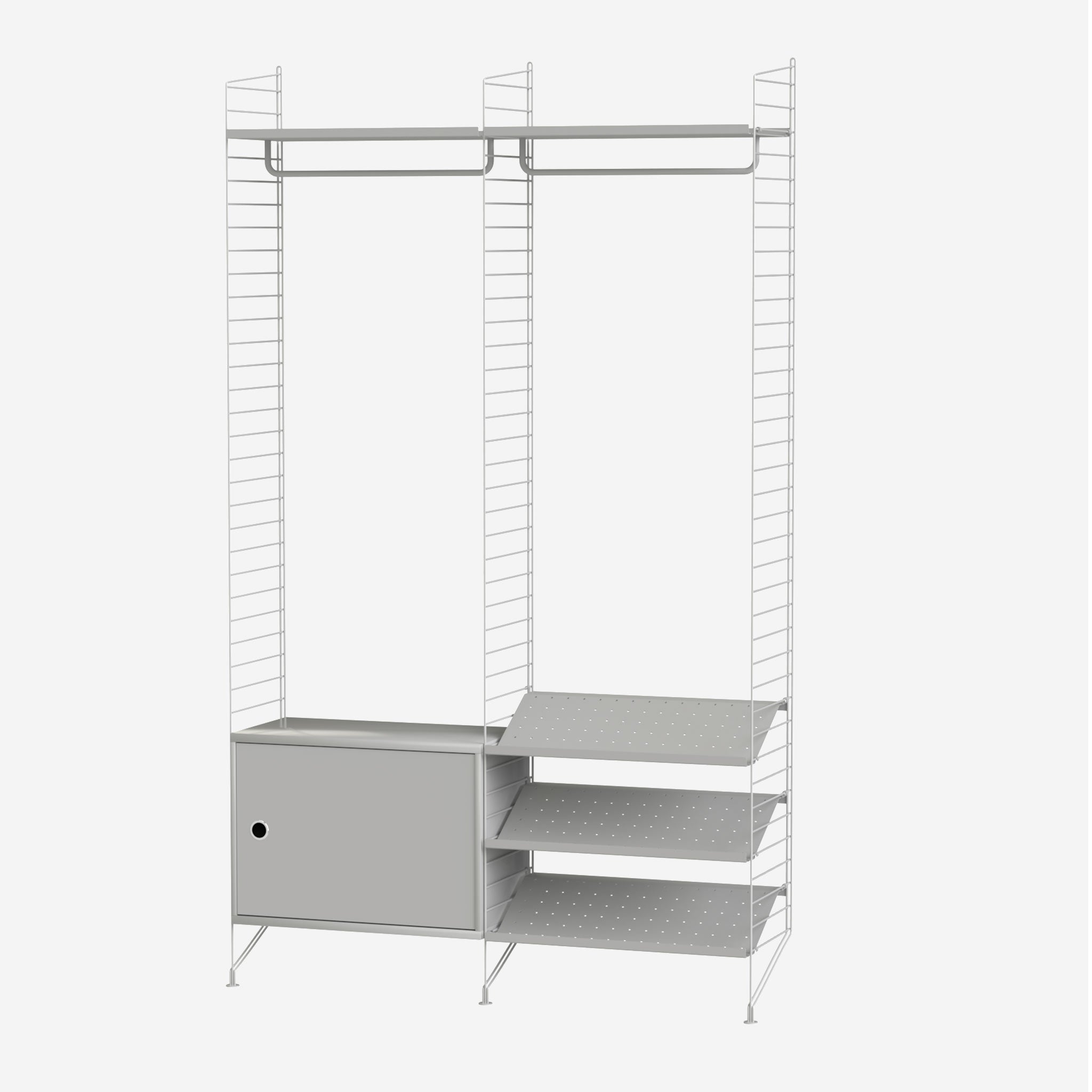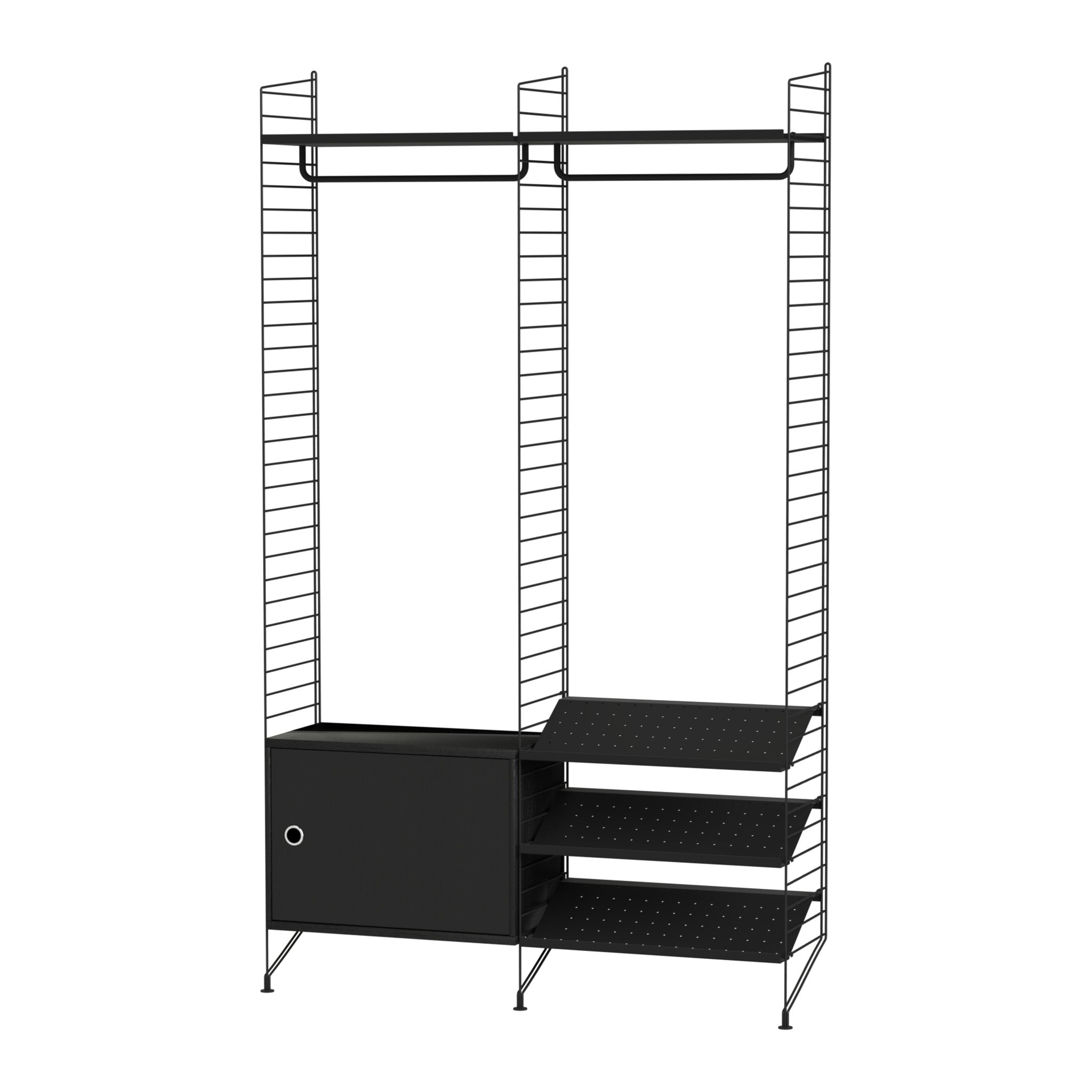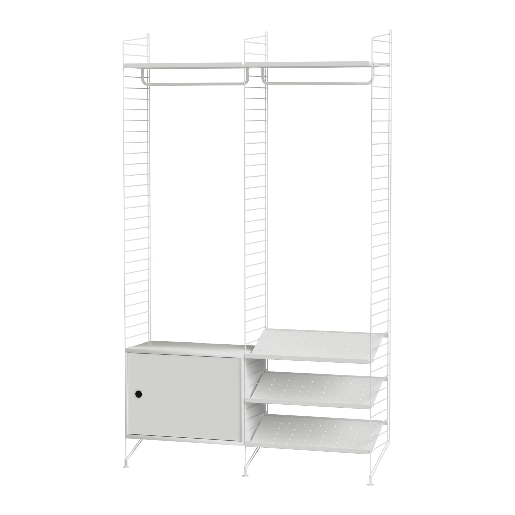String Regal – optimal für Ihren Flur. Bodenleitern, Regalböden aus Metall mit niedriger Kante, Schuhablagen, Schrank mit Schwenktür, Stangen und Haken. Diese Regalkombination bietet im Flur Platz für all Ihre Jacken, Mäntel, Taschen und Schuhe.