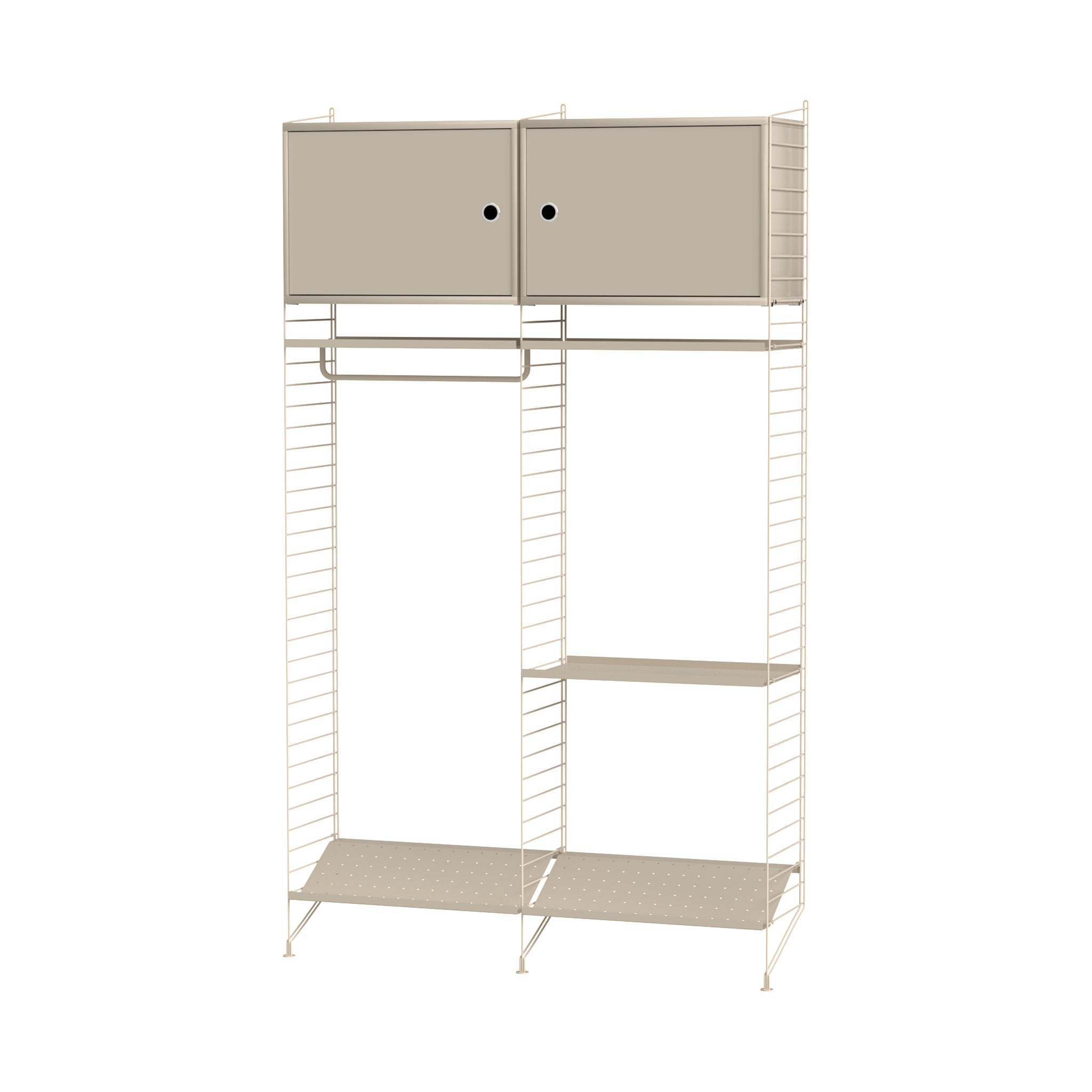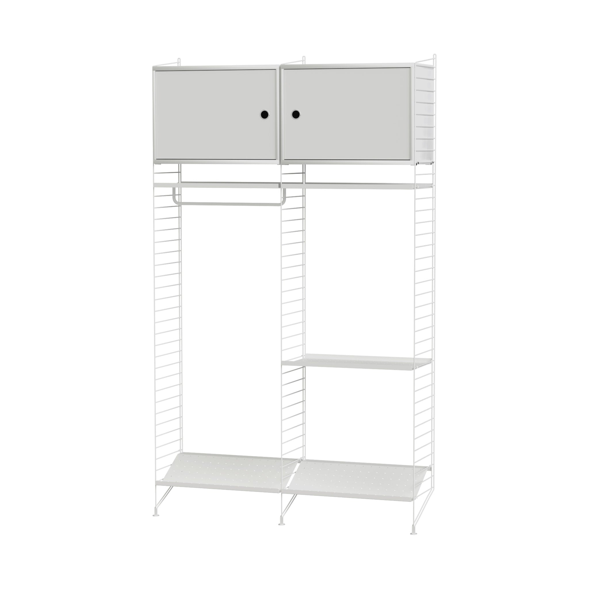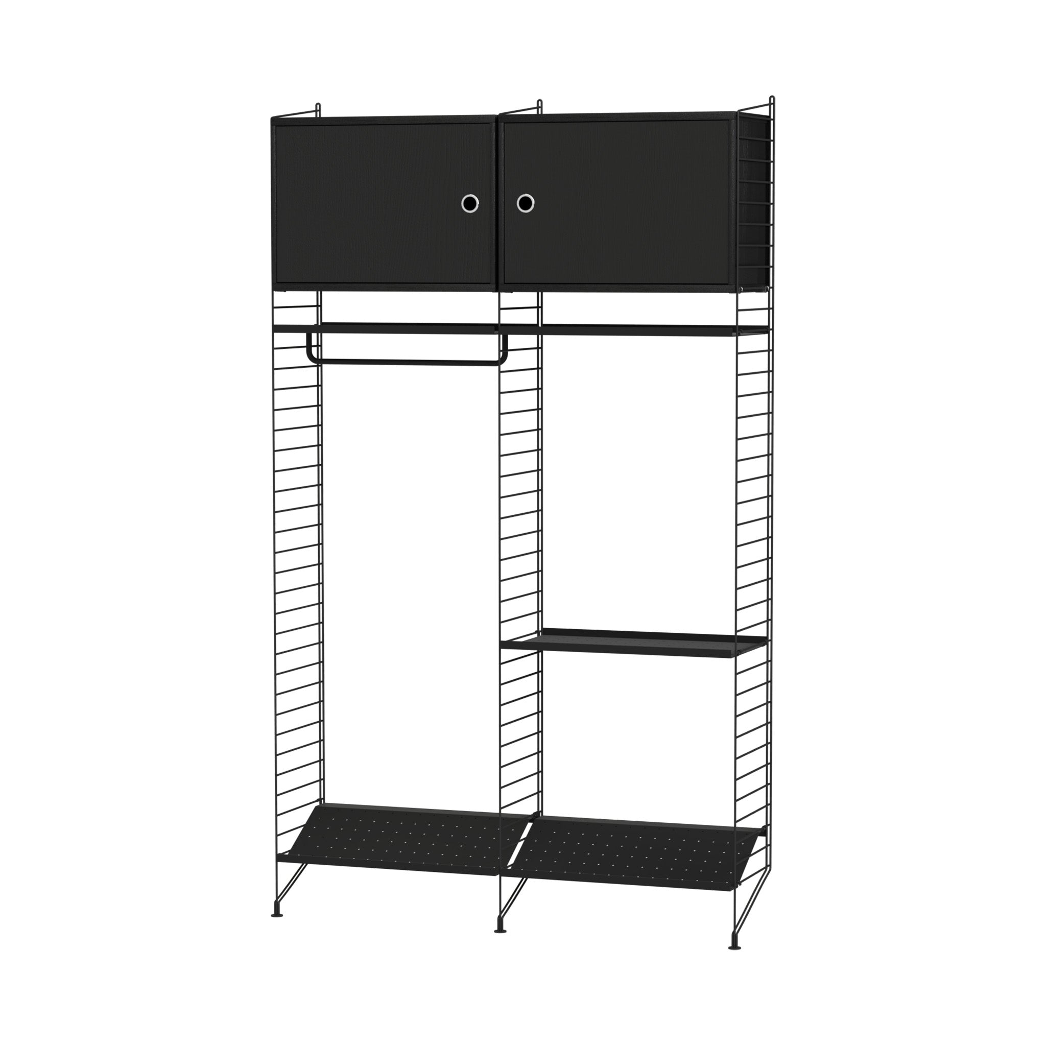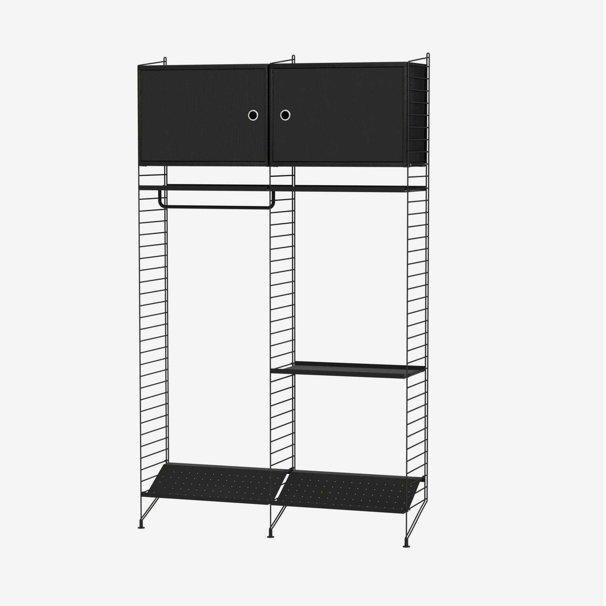 String Regal – optimal für Ihren Flur. Bodenleitern, Regalböden aus Metall mit niedriger Kante, Schränke mit Schwenktür und Schuhablagen, Stangen und Haken. Diese Regalkombination bietet im Flur Platz für alle Ihre Jacken, Mäntel, Taschen und Schuhe und bietet Ihnen gleichzeitig die Möglichkeit zur versteckten Aufbewahrung.