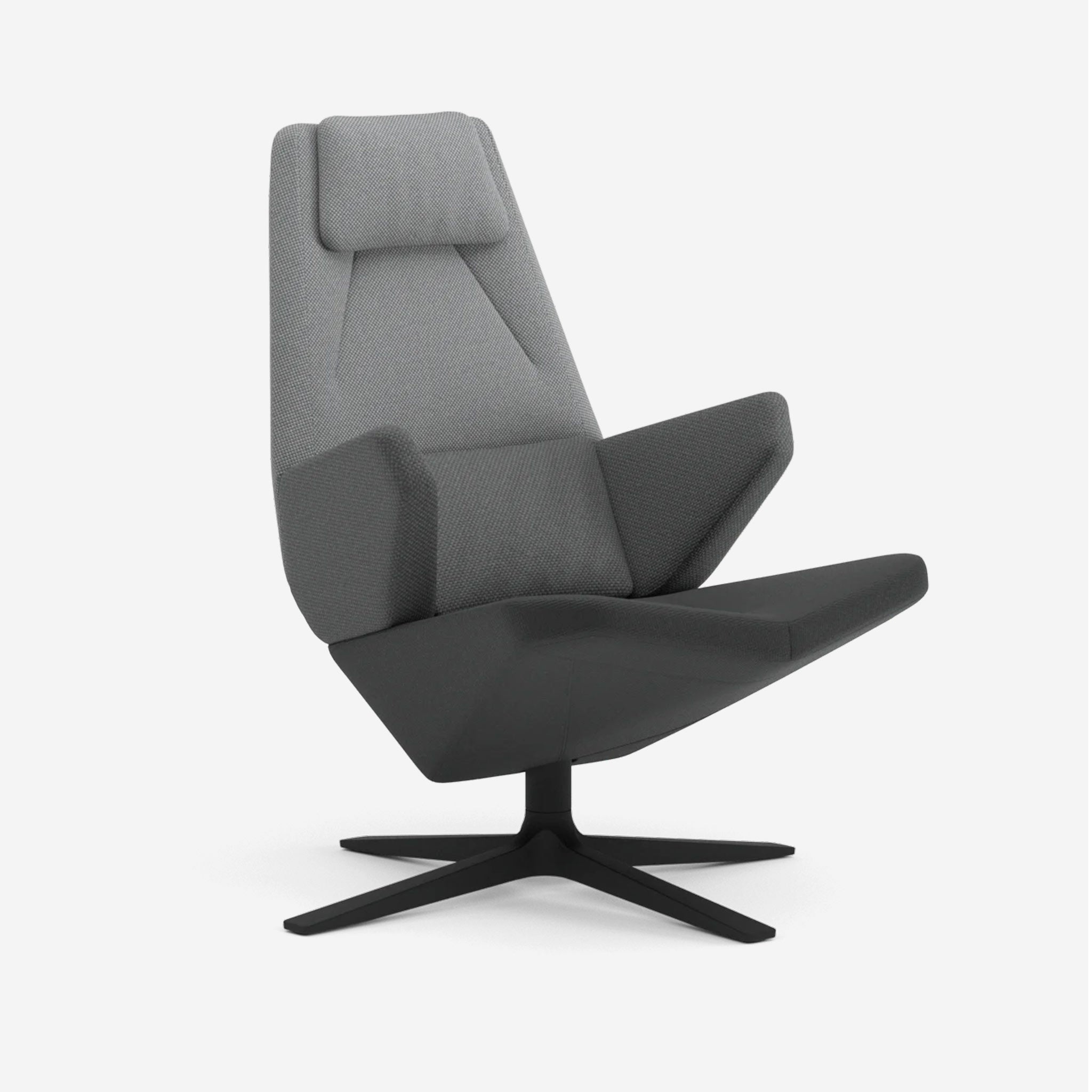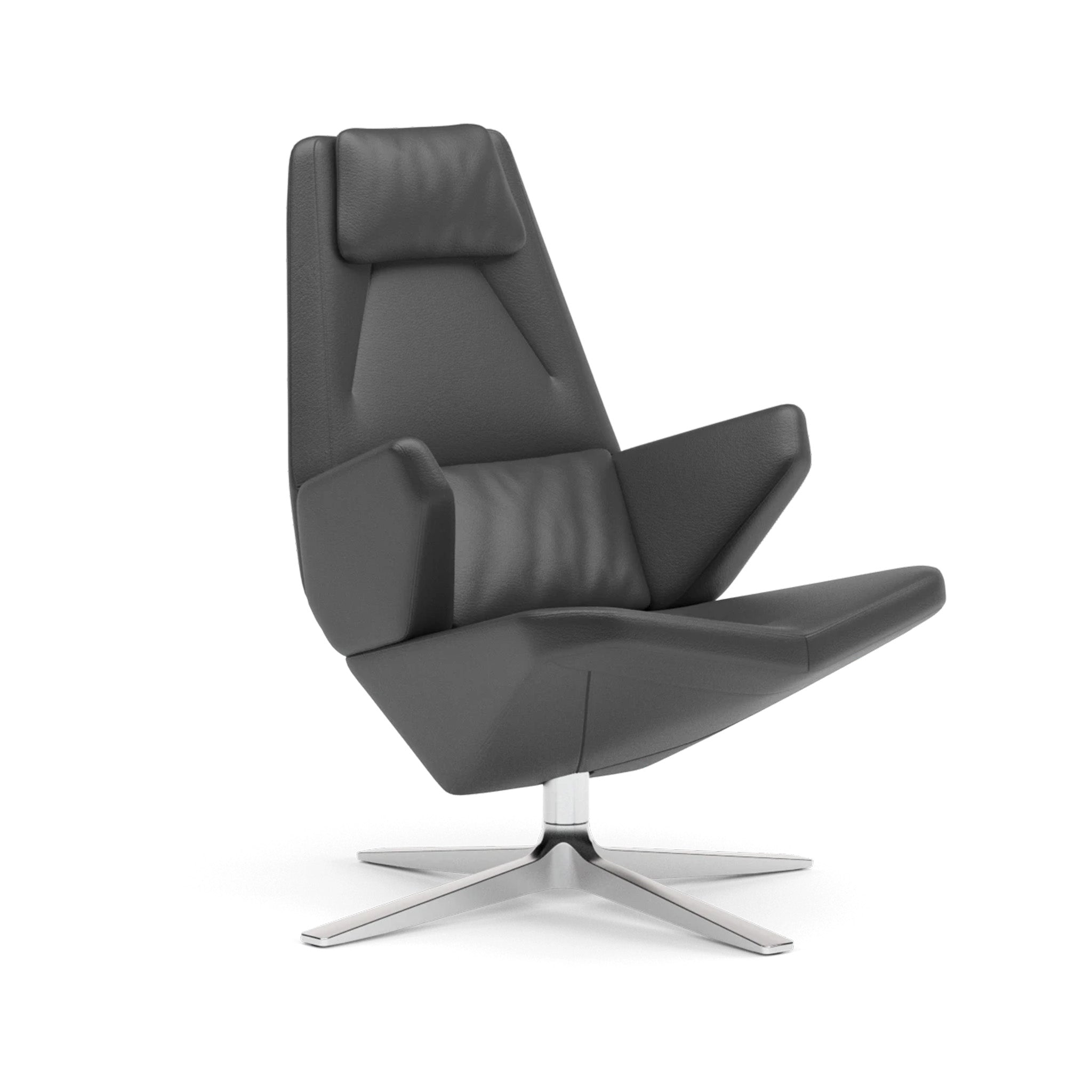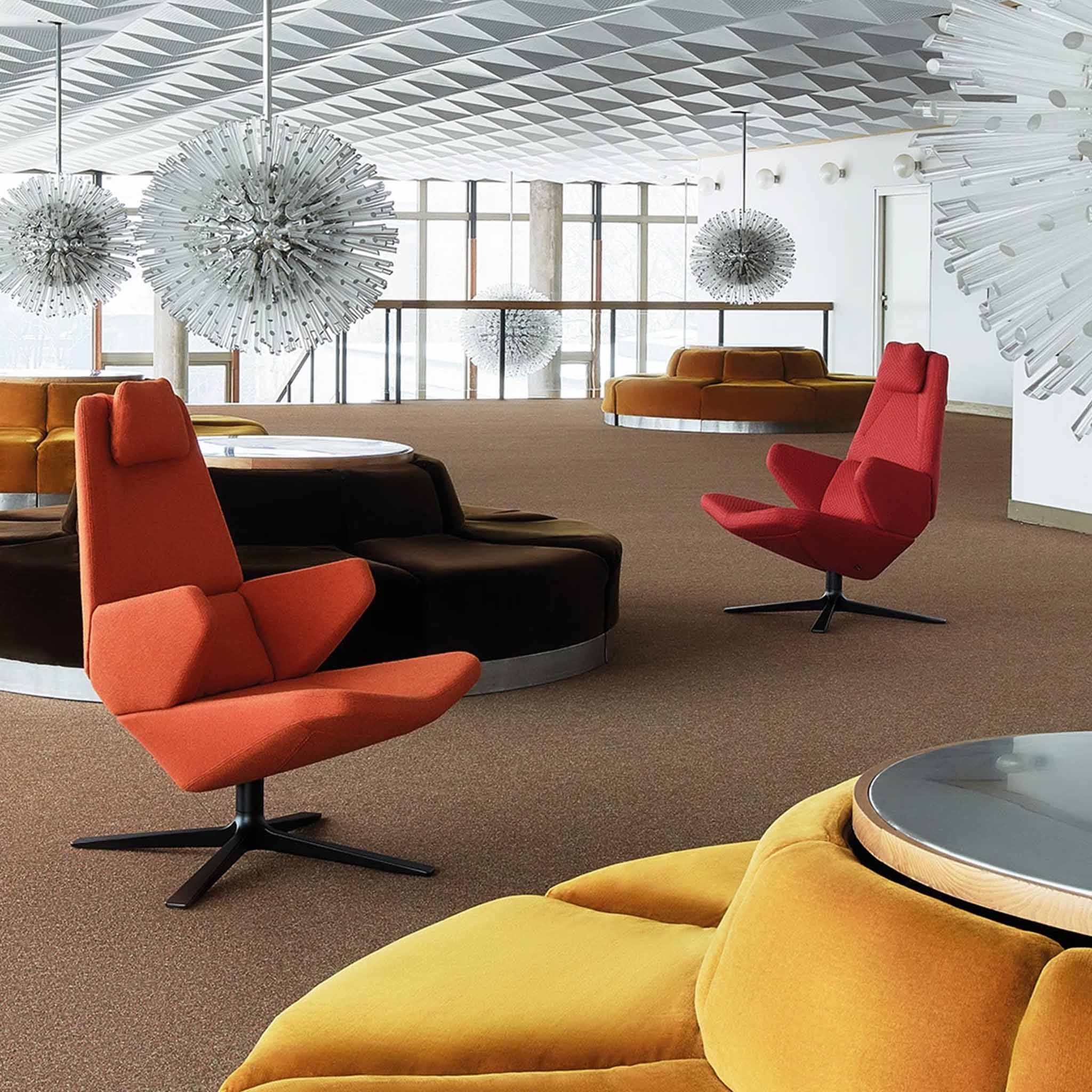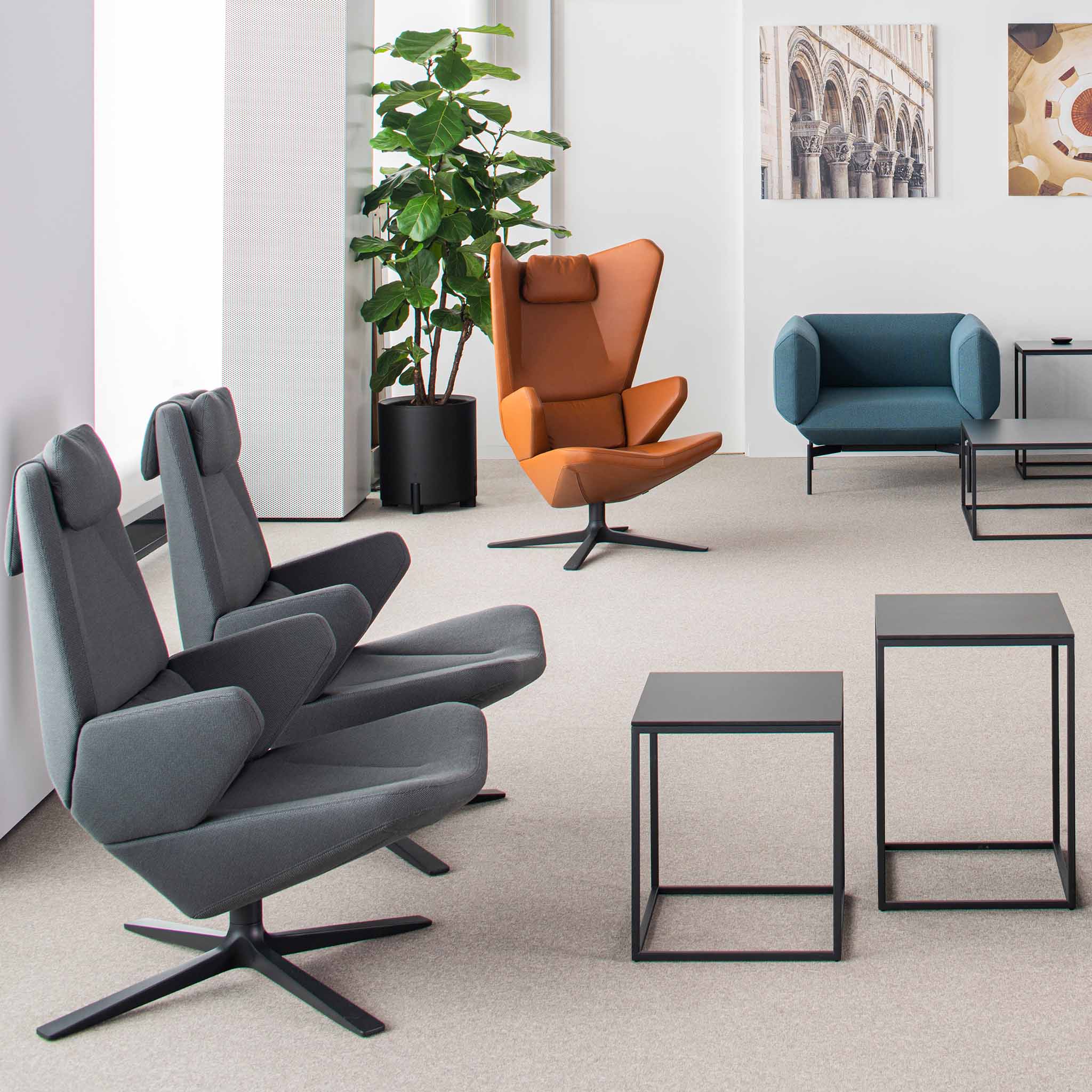 Lowback-Sessel, Highback-Sessel sowie Ohrensessel haben charakteristische dreiteilige Struktur und teilen sich ähnliche Dreieckformen, die sich aus einem imaginären Mittelpunkt ausbreiten und dadurch einen spezifischen floralen Objektcharakter ergeben.