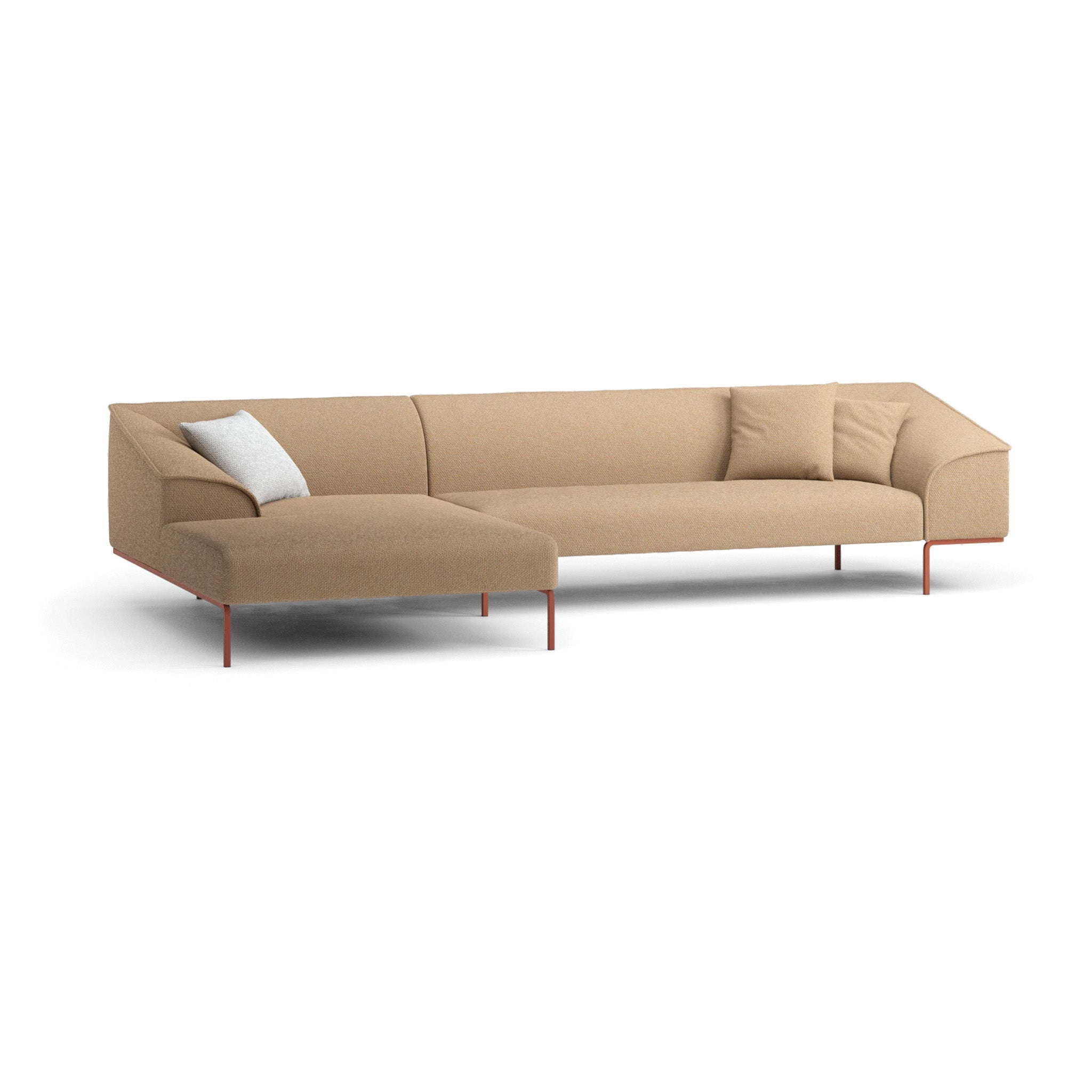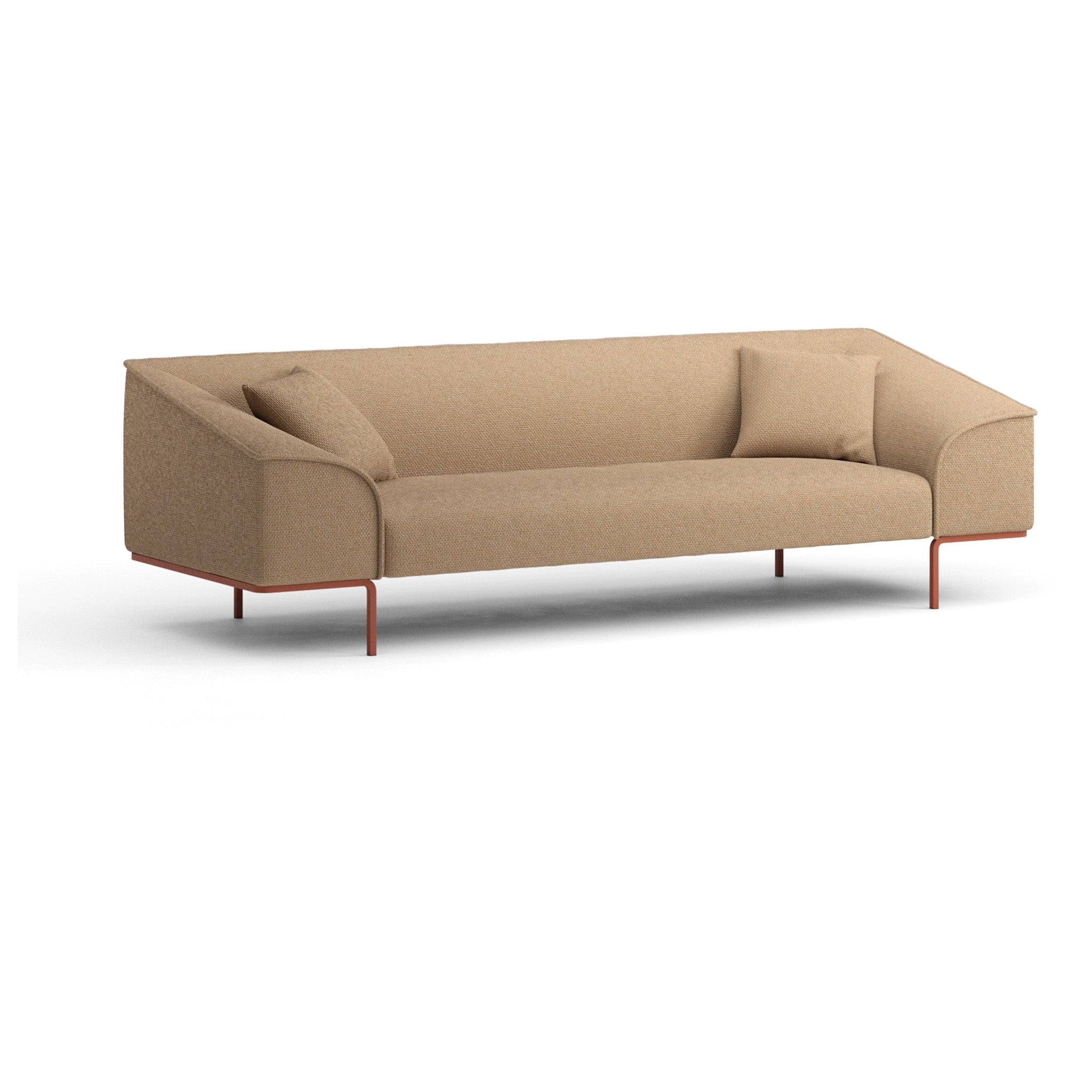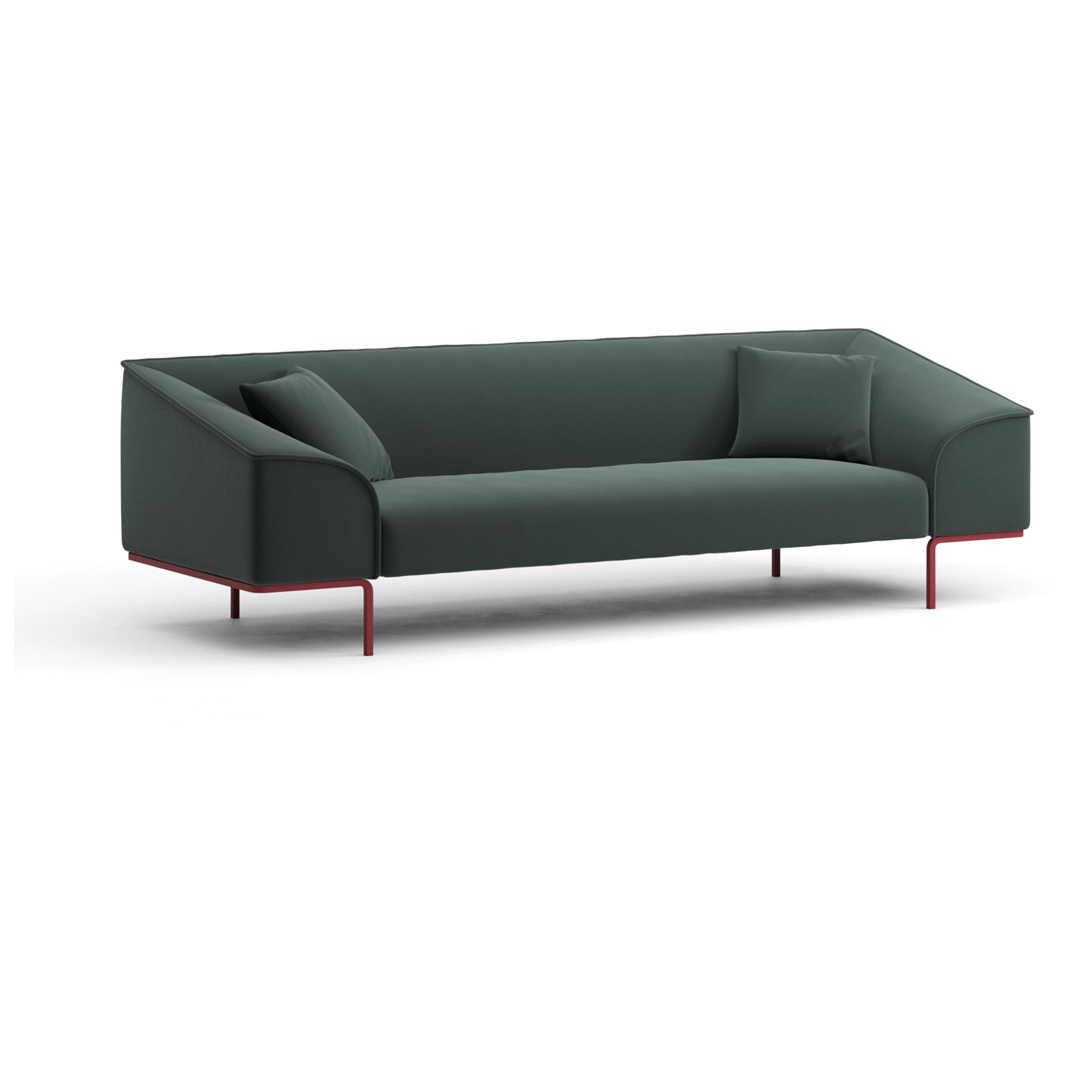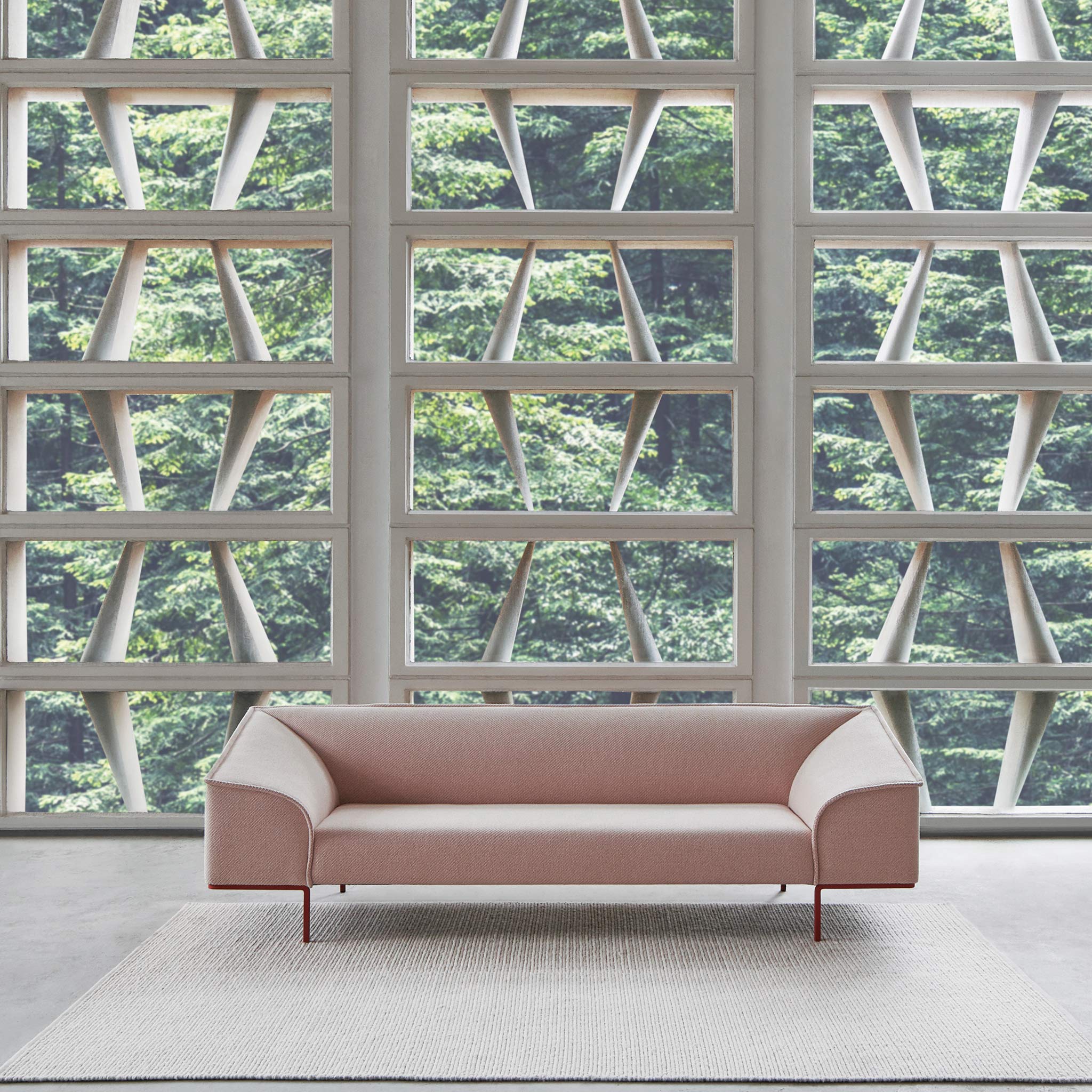 Das Seam-Sofa zeichnet sich durch seine einzigartige Linie aus, die sich entlang der gesamten Länge des Sofas erstreckt und dadurch seine Form abzeichnet. Sichtbare blattader ähnliche Nähte bestimmen seine organische Struktur. Die flachen Außenkonturen stehen im Gegensatz zur Weichheit der gefüllten Sitzkissen, der Armlehnen sowie der Rückenlehne. Schlanke Beine aus gebogenen Vierkantstäben setzen die Nähte optisch fort und verleihen Leichtigkeit. Aufgrund von schrägen Seiten stellt Seam ein einzigartiges Sofa-System dar, was es – genau wie seine Form – noch bequemer macht.