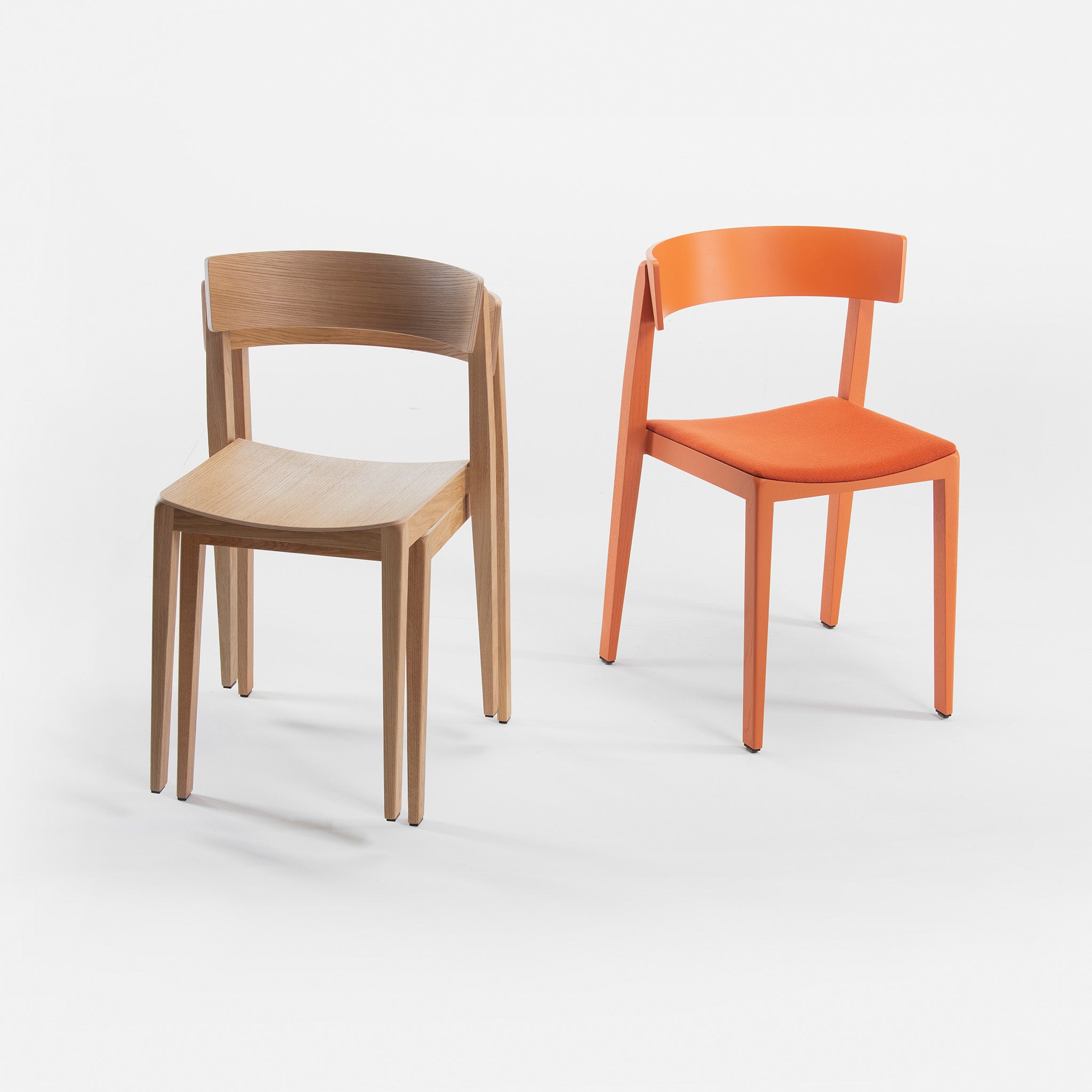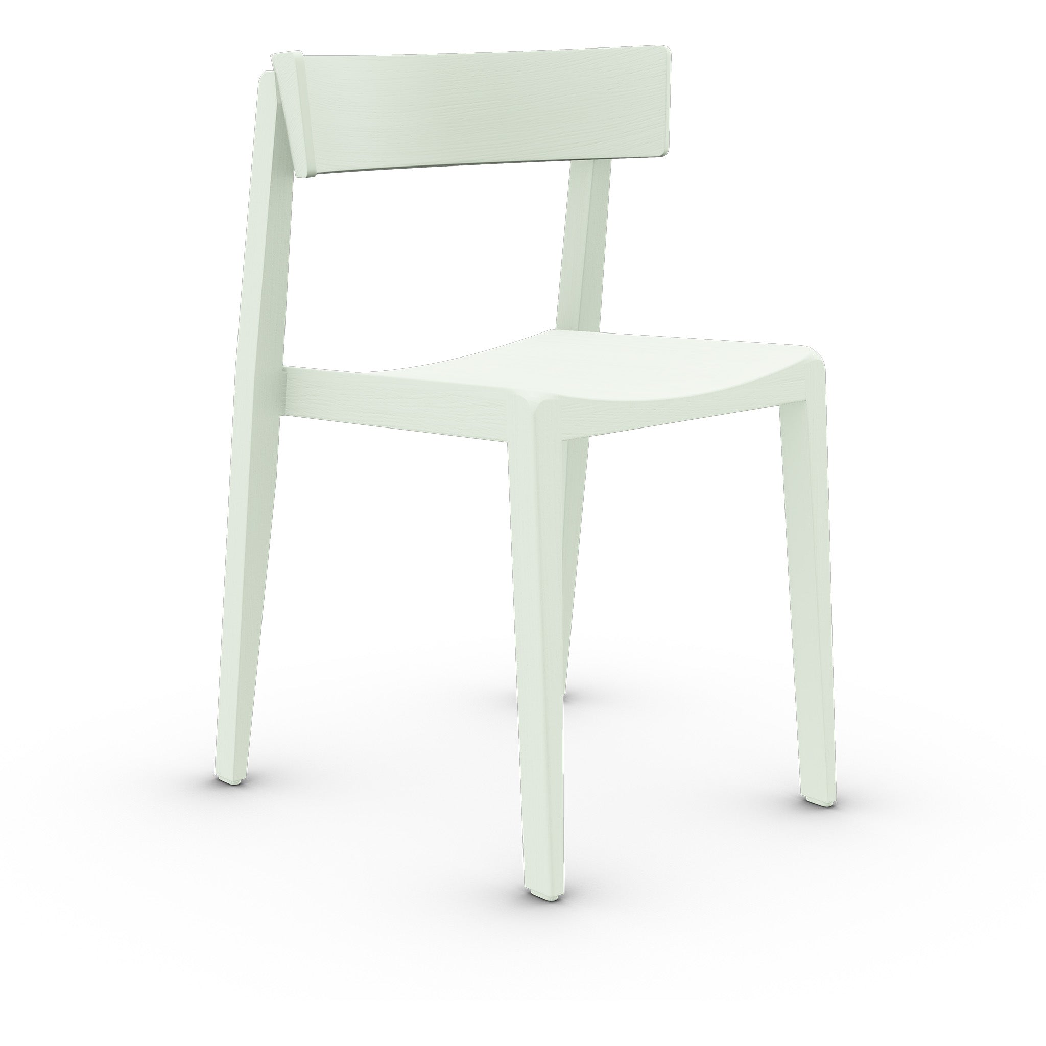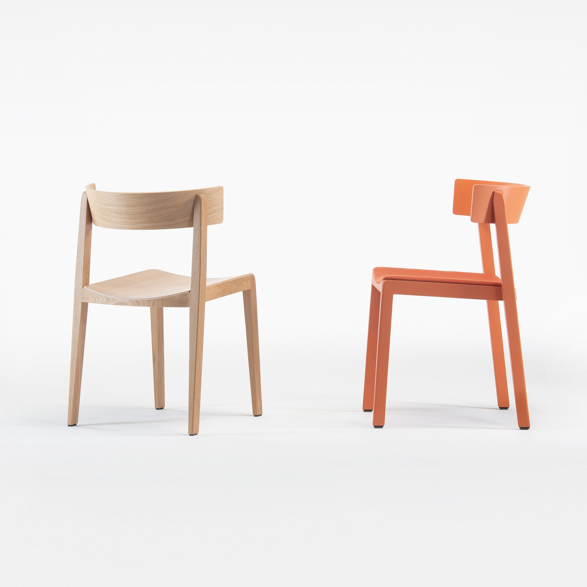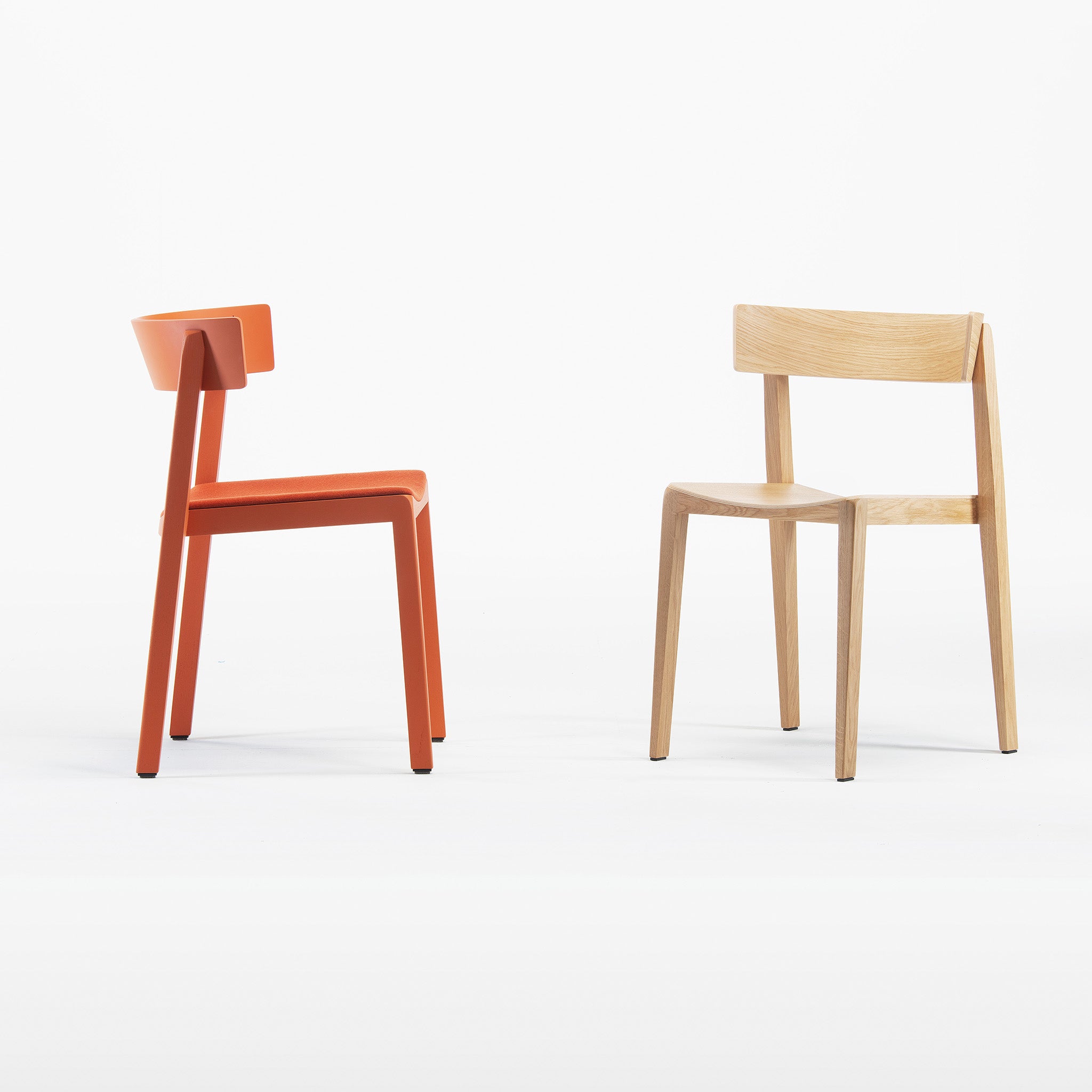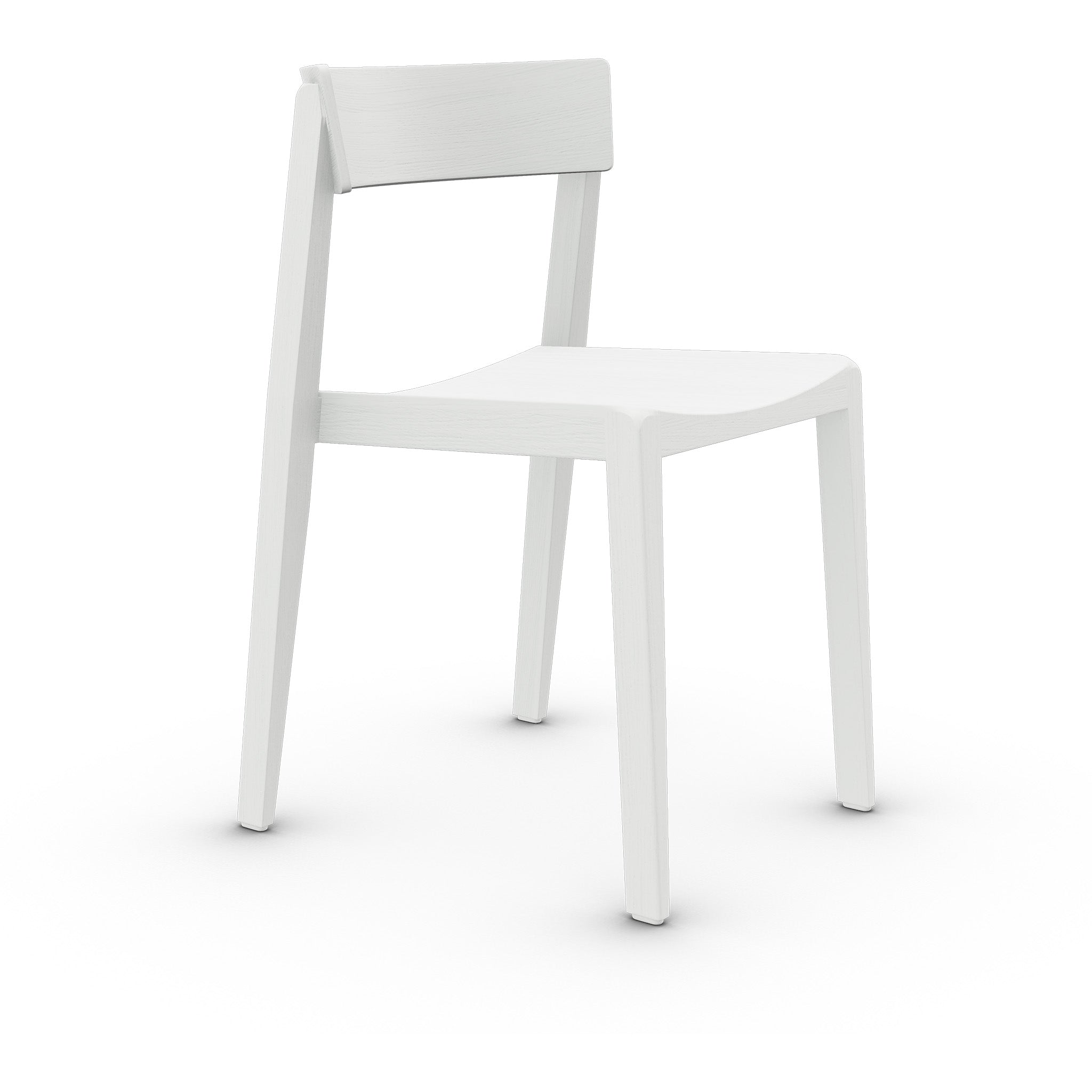 Eine kaum sichtbare Verjüngung der Beine, Neigung der Hinterbeine und leicht betonte Rundung der Rückenlehne prägen den Charakter dieses ansonsten archetypischen Stuhls. Die breiteren Hinterbeine sind leicht zur Seite gestreckt und ermöglichen dadurch ein einfaches Stapeln, wenn die Stühle nicht benutzt werden.