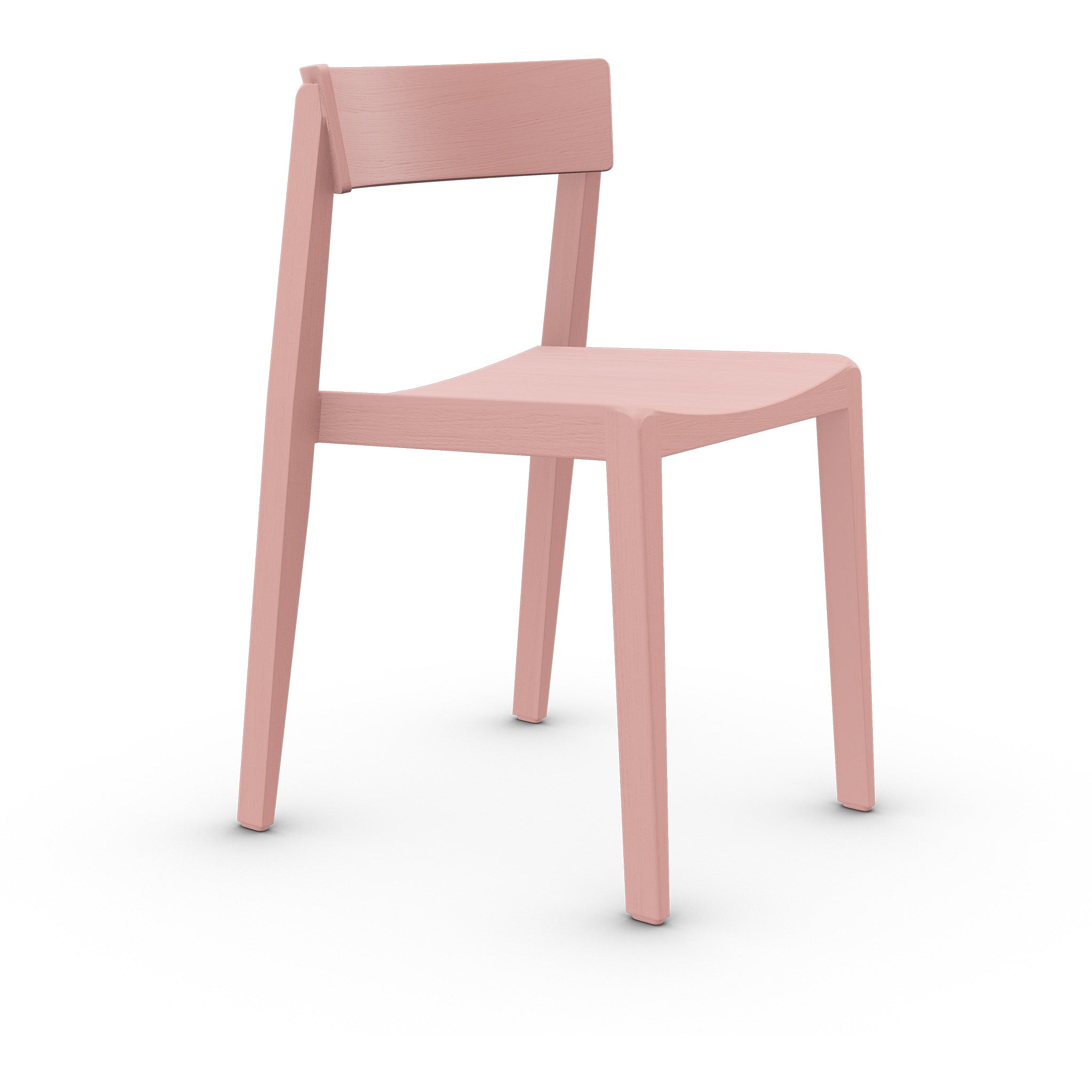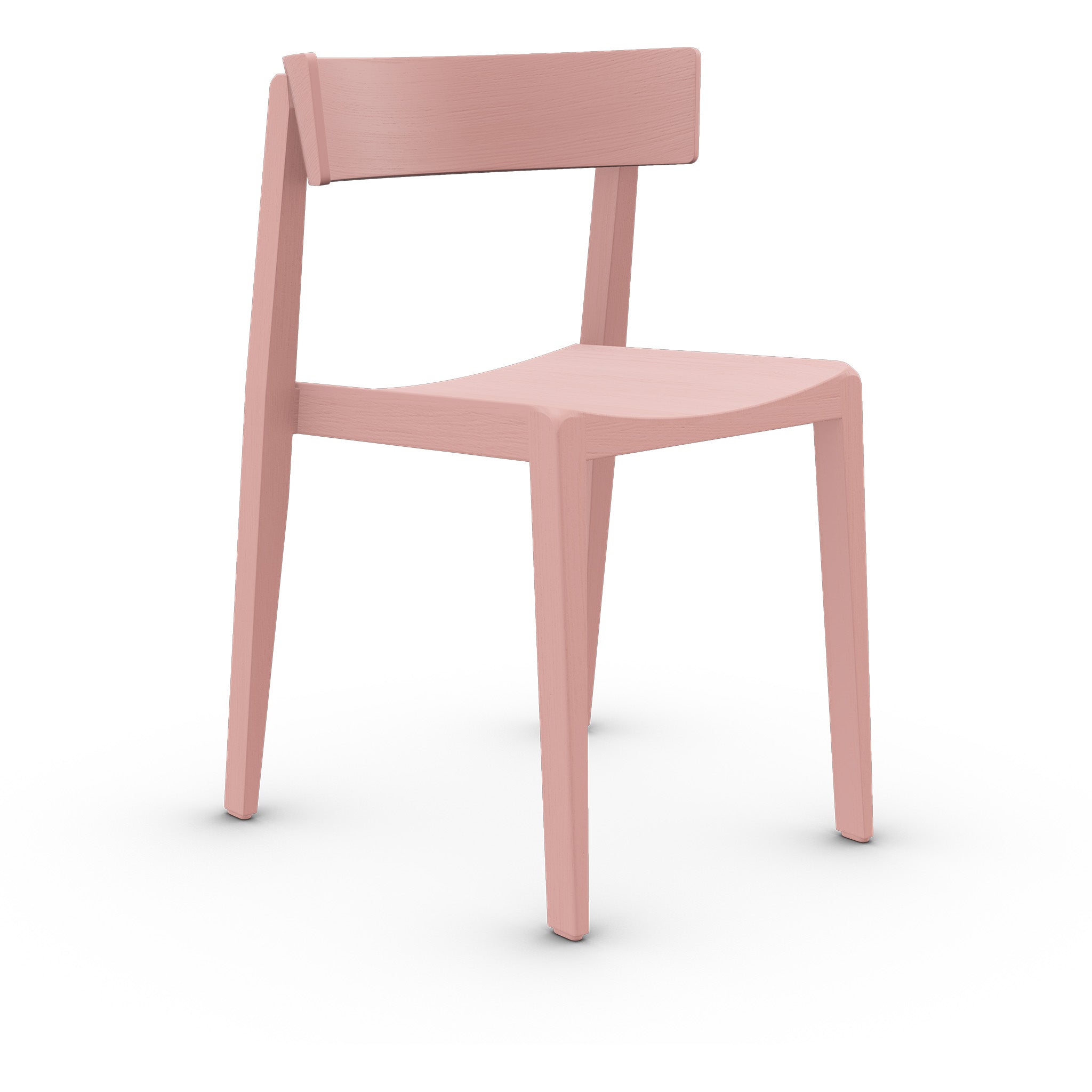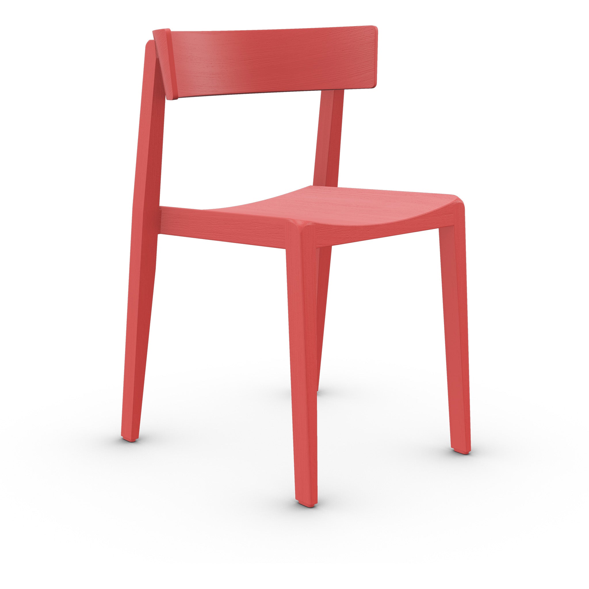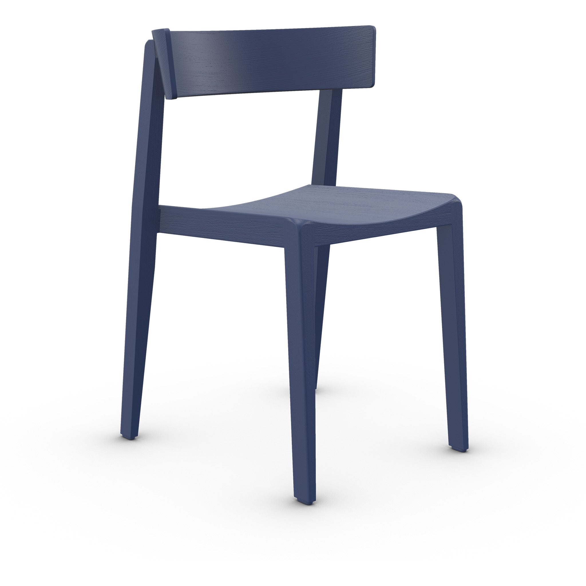 Eine kaum sichtbare Verjüngung der Beine, Neigung der Hinterbeine und leicht betonte Rundung der Rückenlehne prägen den Charakter dieses ansonsten archetypischen Stuhls. Die breiteren Hinterbeine sind leicht zur Seite gestreckt und ermöglichen dadurch ein einfaches Stapeln, wenn die Stühle nicht benutzt werden.