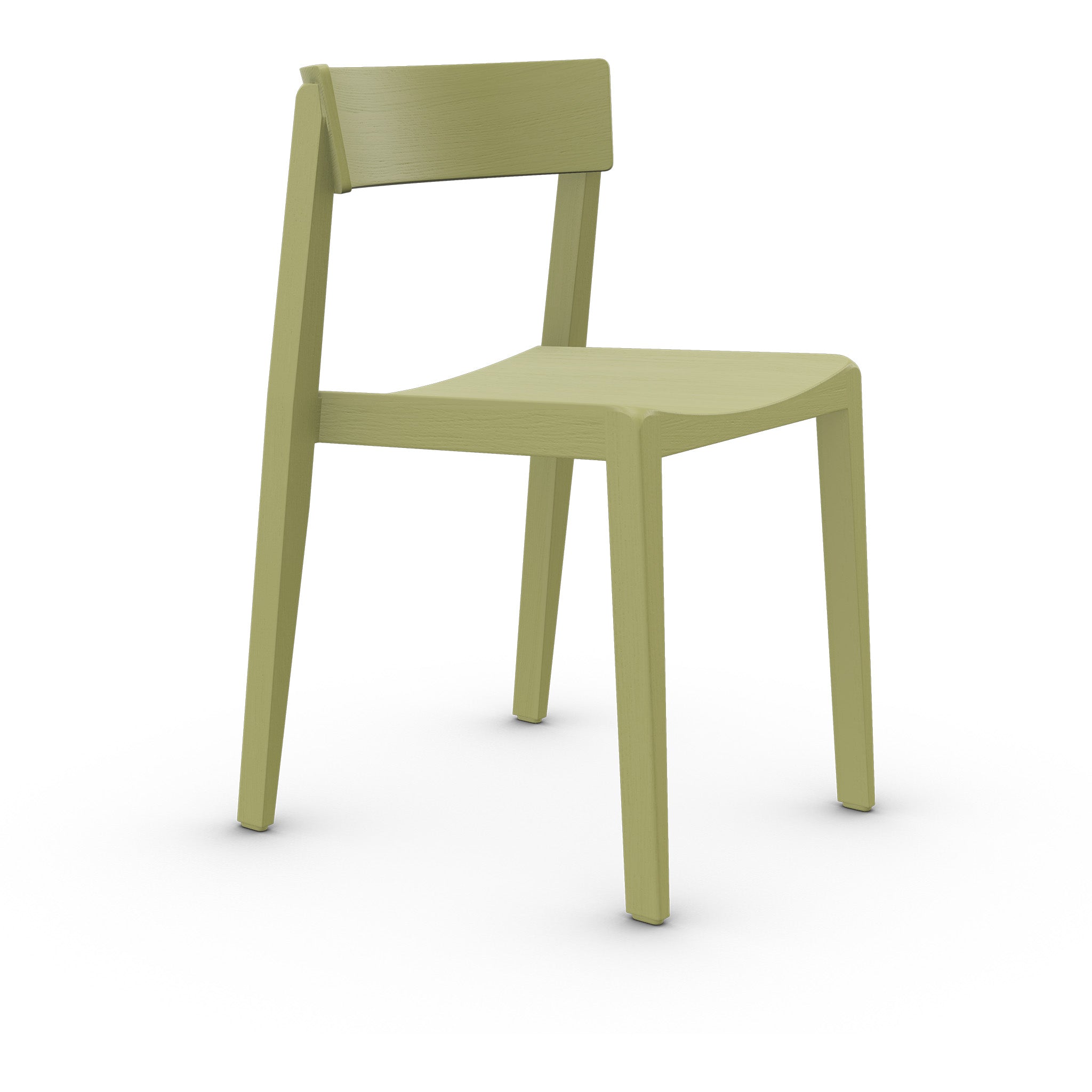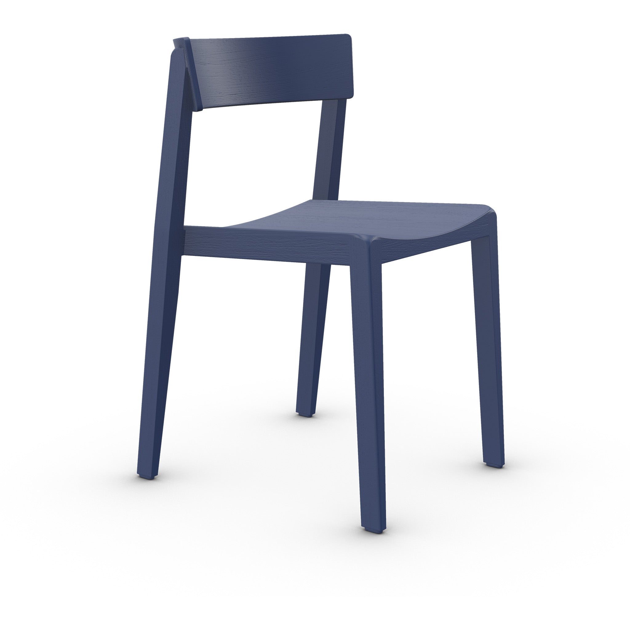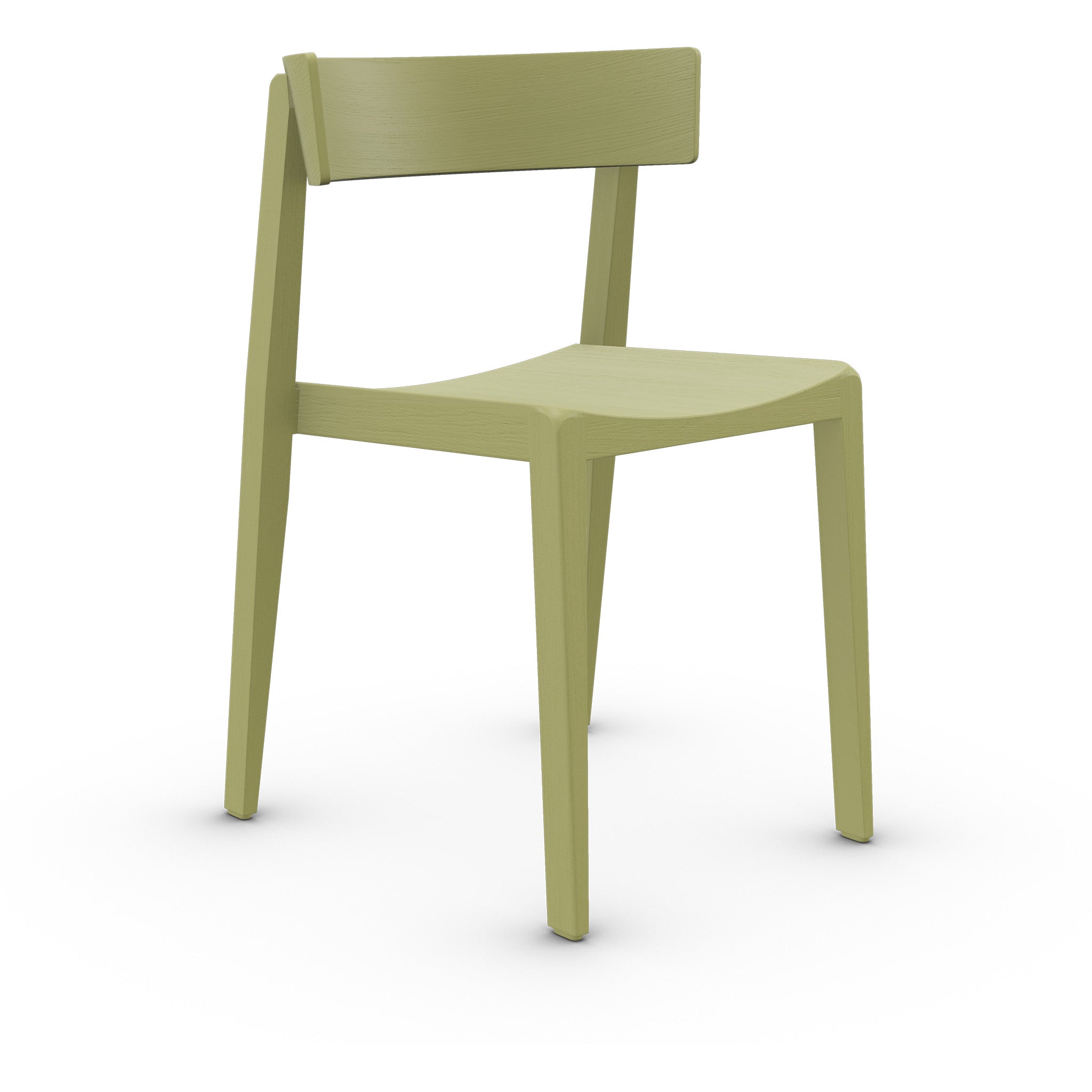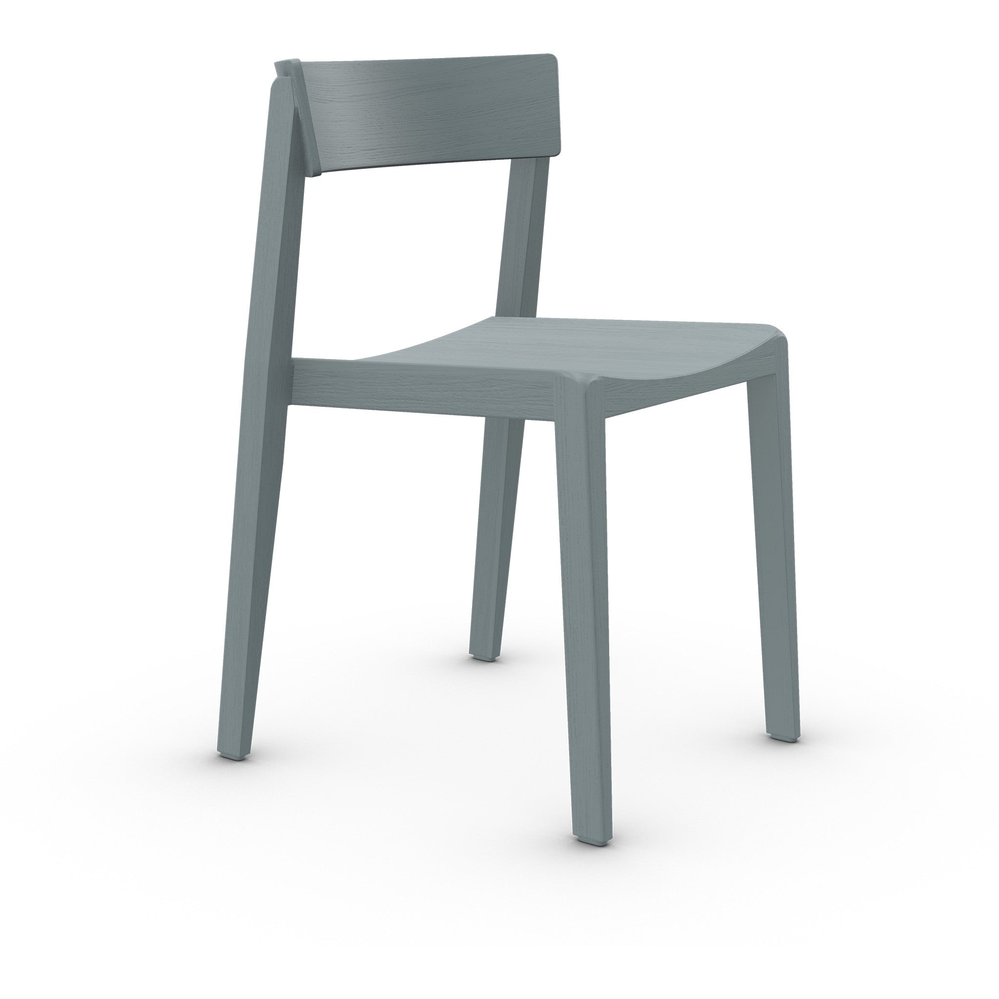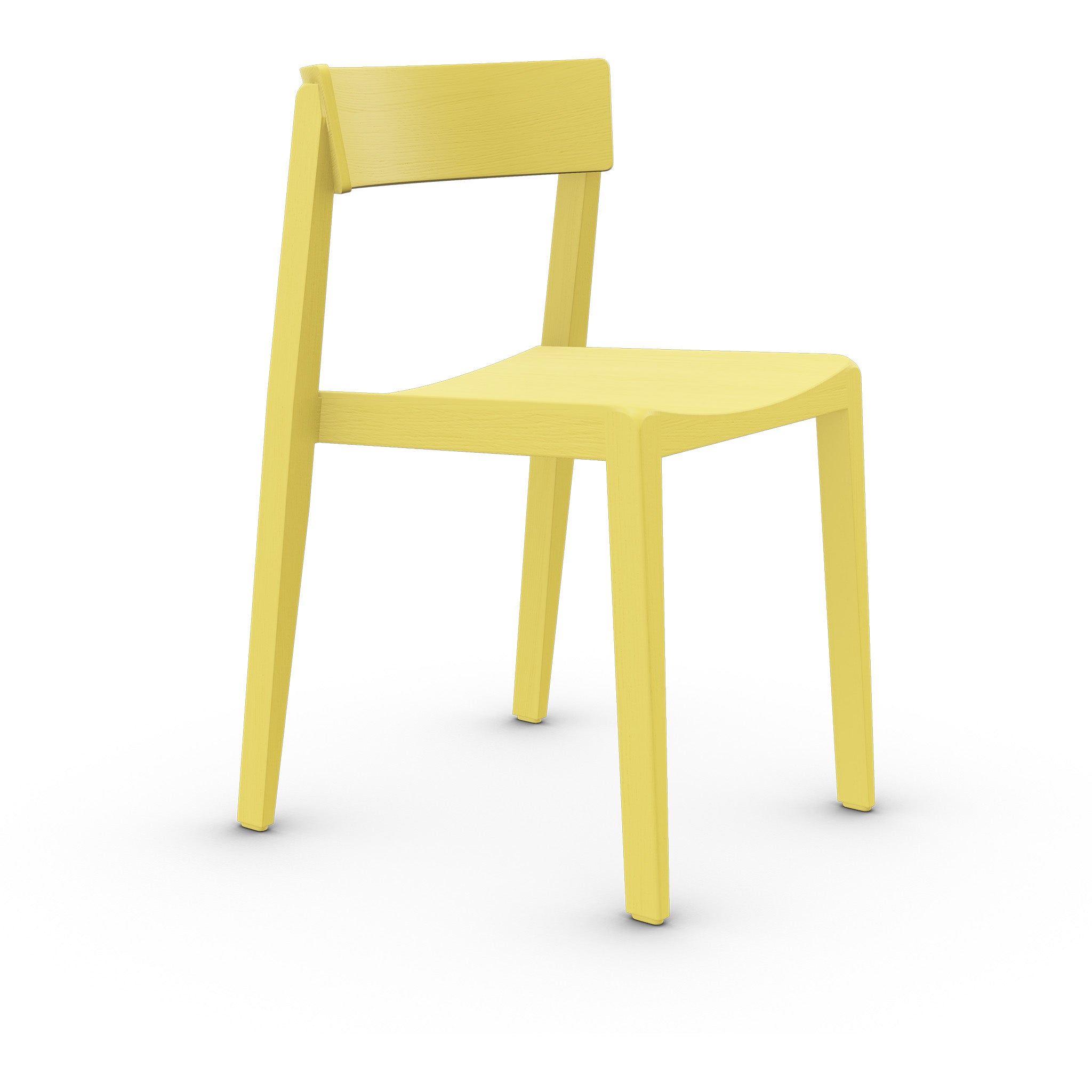 Eine kaum sichtbare Verjüngung der Beine, Neigung der Hinterbeine und leicht betonte Rundung der Rückenlehne prägen den Charakter dieses ansonsten archetypischen Stuhls. Die breiteren Hinterbeine sind leicht zur Seite gestreckt und ermöglichen dadurch ein einfaches Stapeln, wenn die Stühle nicht benutzt werden.