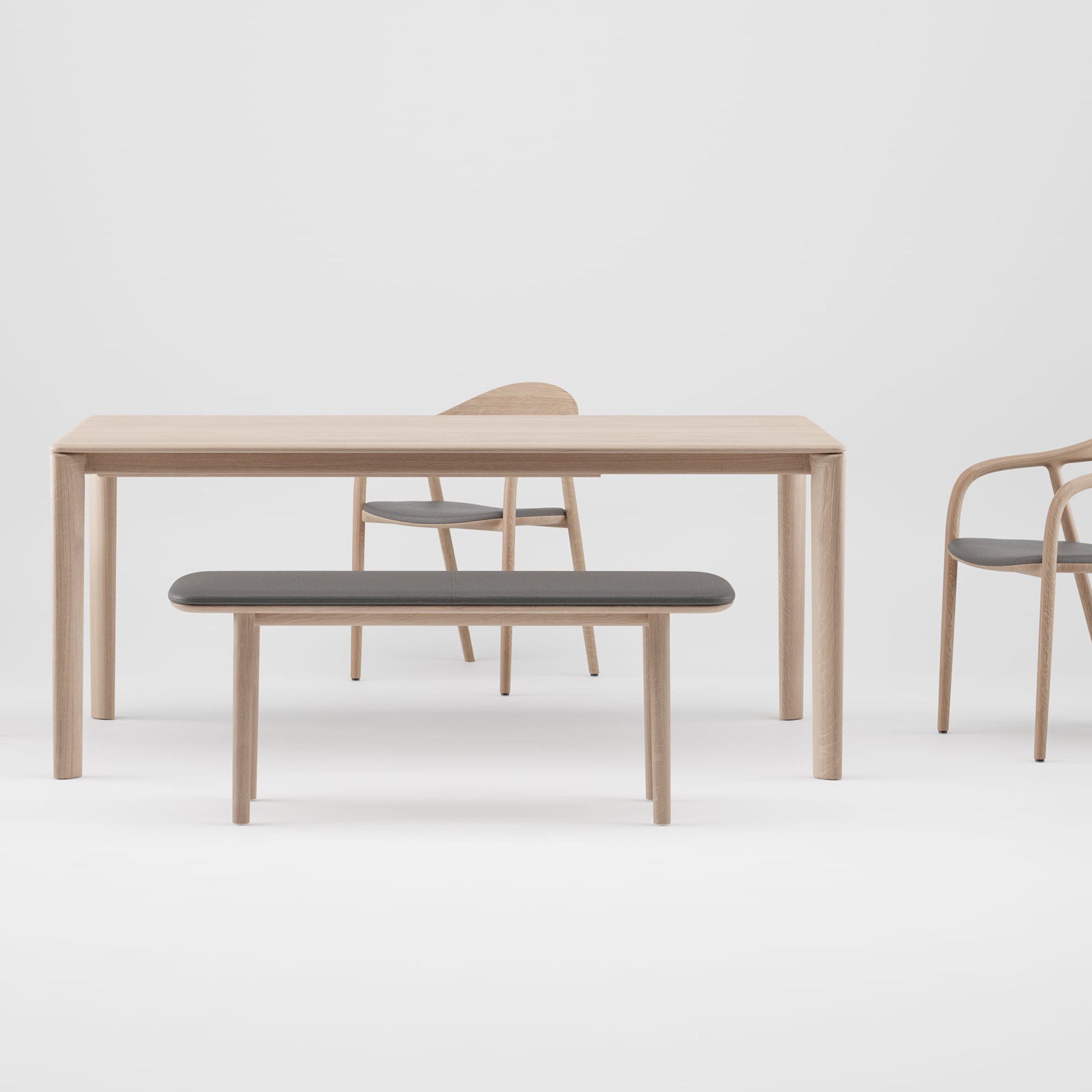 Ein kontinuierlicher Fluss sanfter Linien definiert elegante Einheiten; er berücksichtigt Ergonomie und rundet auf raffinierte Weise eine unaufdringliche, aber dennoch erkennbare Ästhetik ab. Wie bei einer Schriftart tauchen bestimmte Elemente in Variationen klar definierter Markenzeichen auf – charakteristische Linien, deren sanfte Holzstrukturen die gewünschte Form nachzeichnen und sich durch eine Veränderung des Linienflusses dem Gebrauch anpassen.