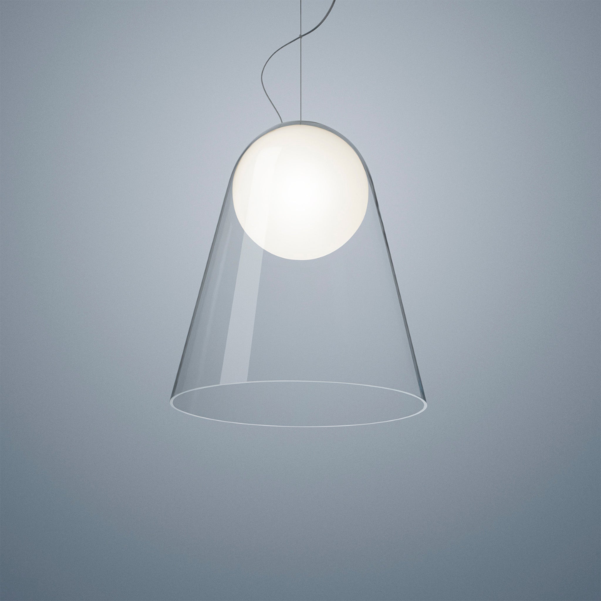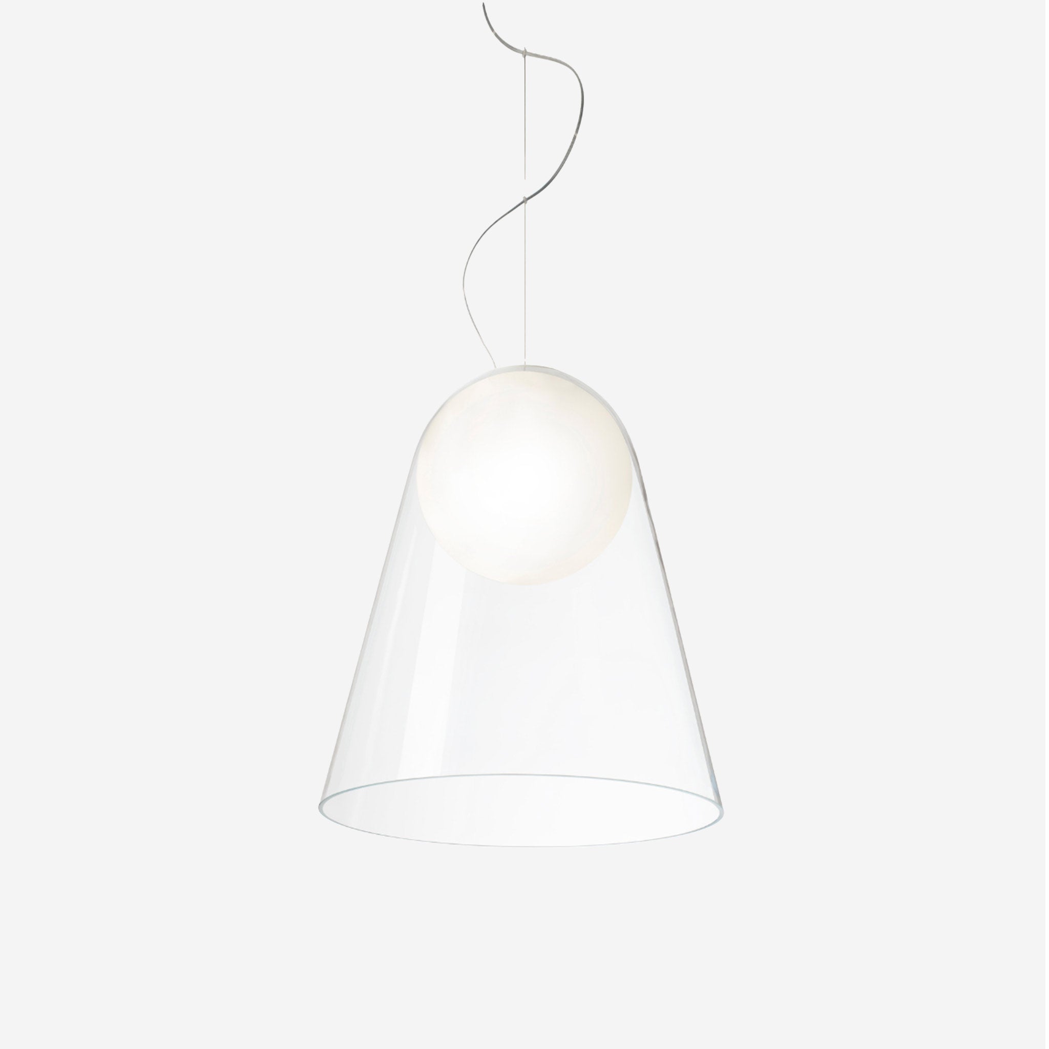 Gefertigt aus mundgeblasenem Glas, besteht sie aus einem satinierten, weißen Diffusor, der von einer transparenten Hülle umschlossen wird. Dieses raffinierte Design erzeugt die Illusion, als würde der leuchtende Kern schwerelos im Inneren schweben.